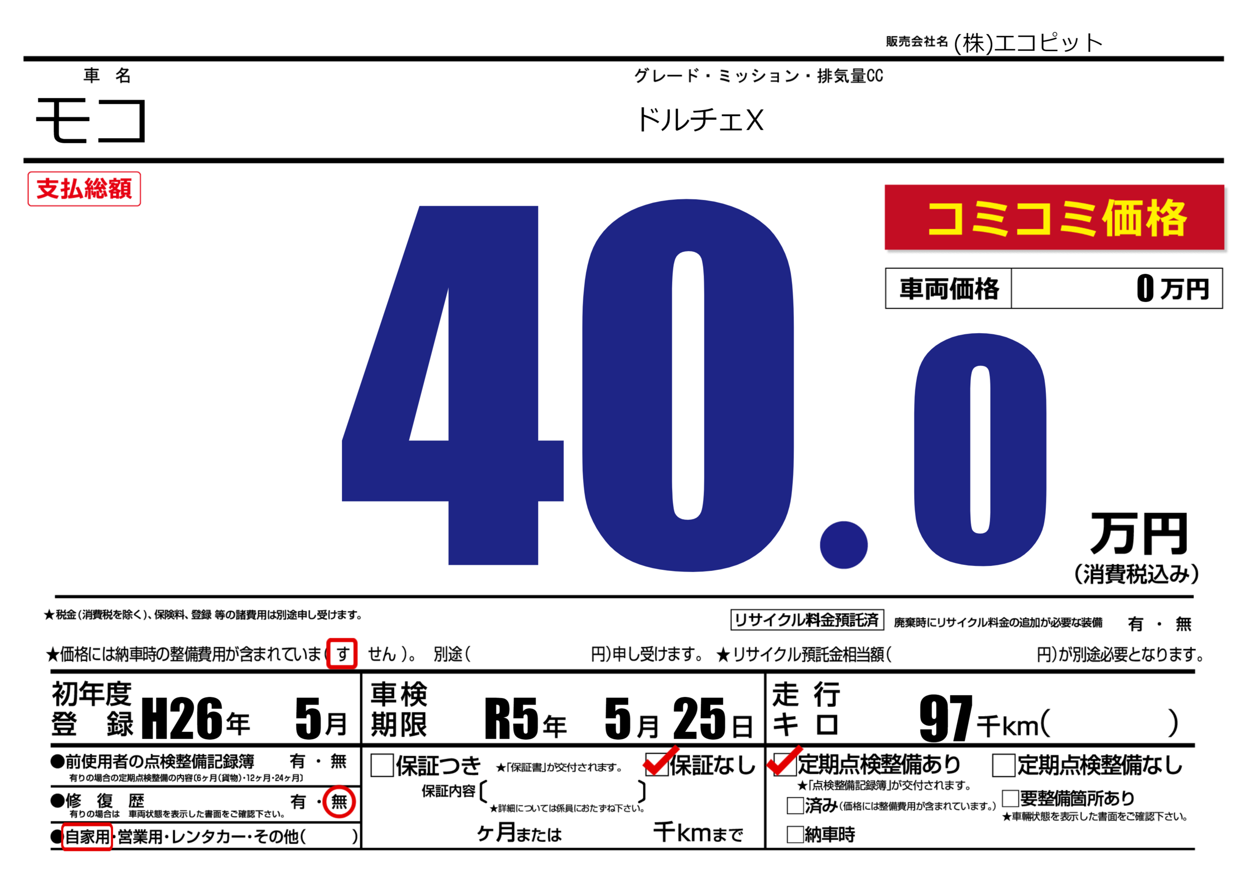 | 走行キロ | 9.7万km | 初年度登録 | H26年5月 |