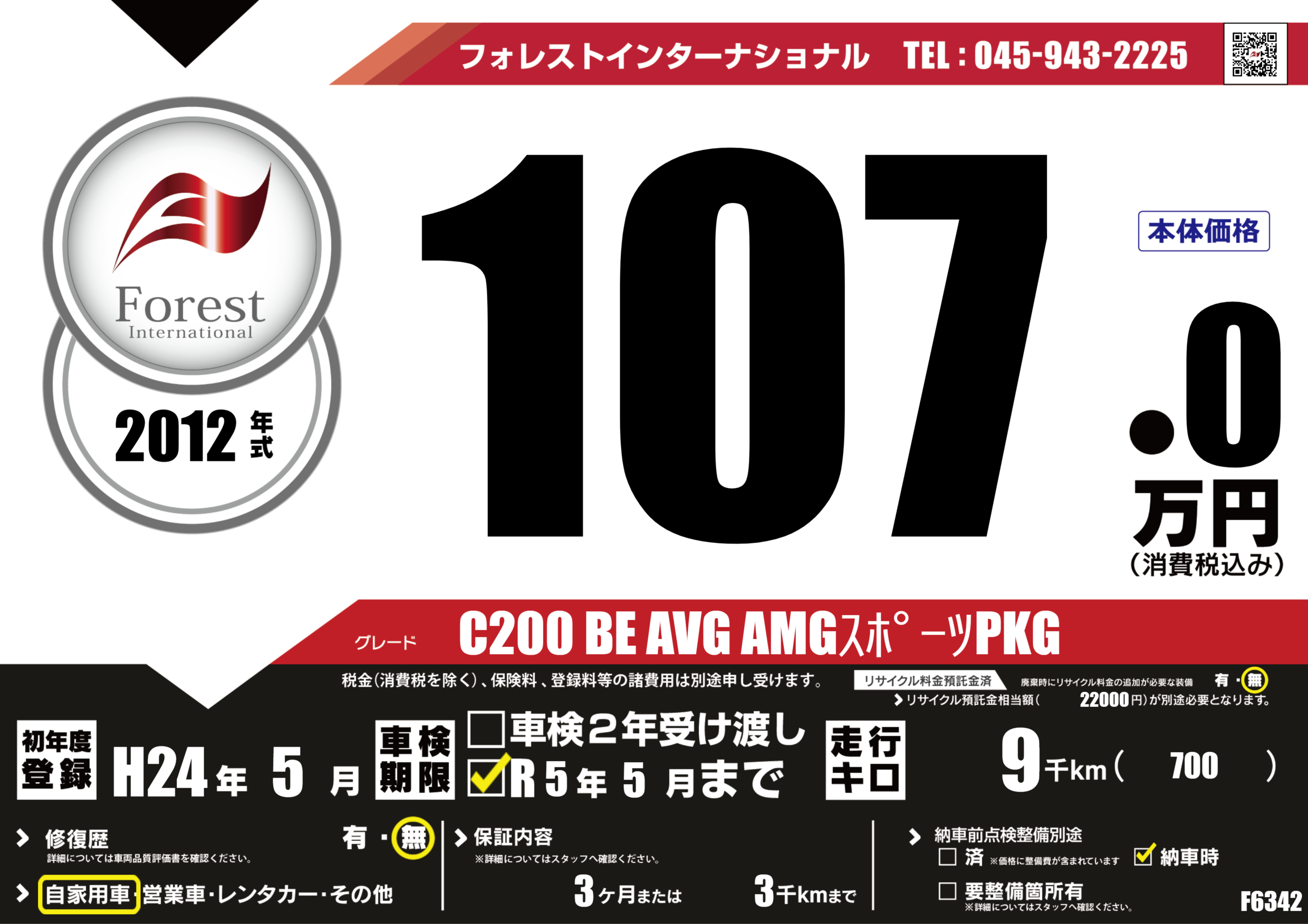 | 走行キロ | 0.9万km | 初年度登録 | H24年5月 |