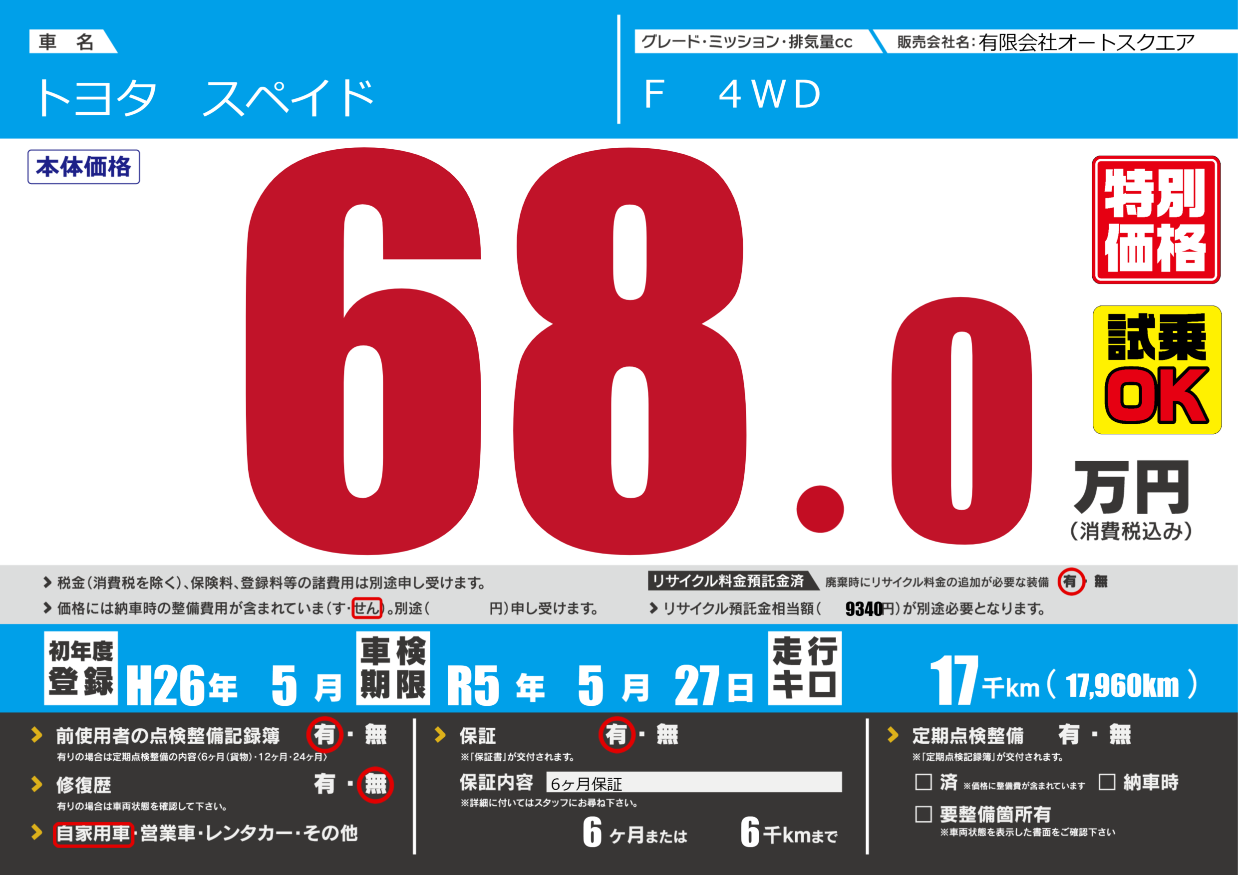 | 車名 | トヨタ スペイド | グレード ミッション 排気量 |