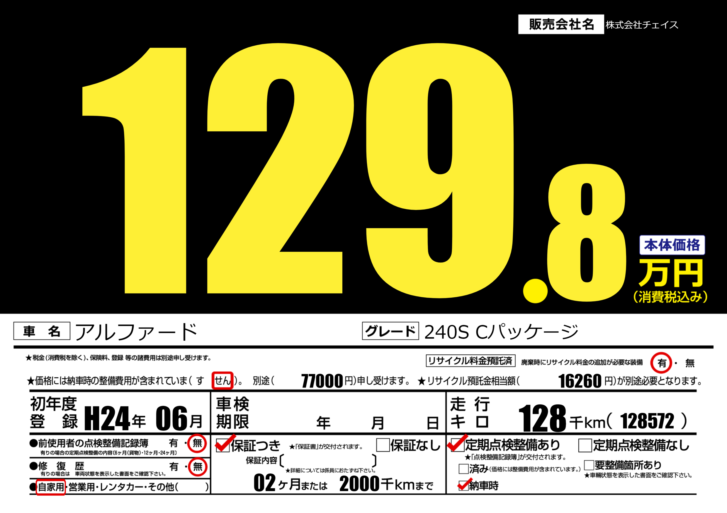 | 走行キロ | 12.8万km | 初年度登録 | H24年06月 |