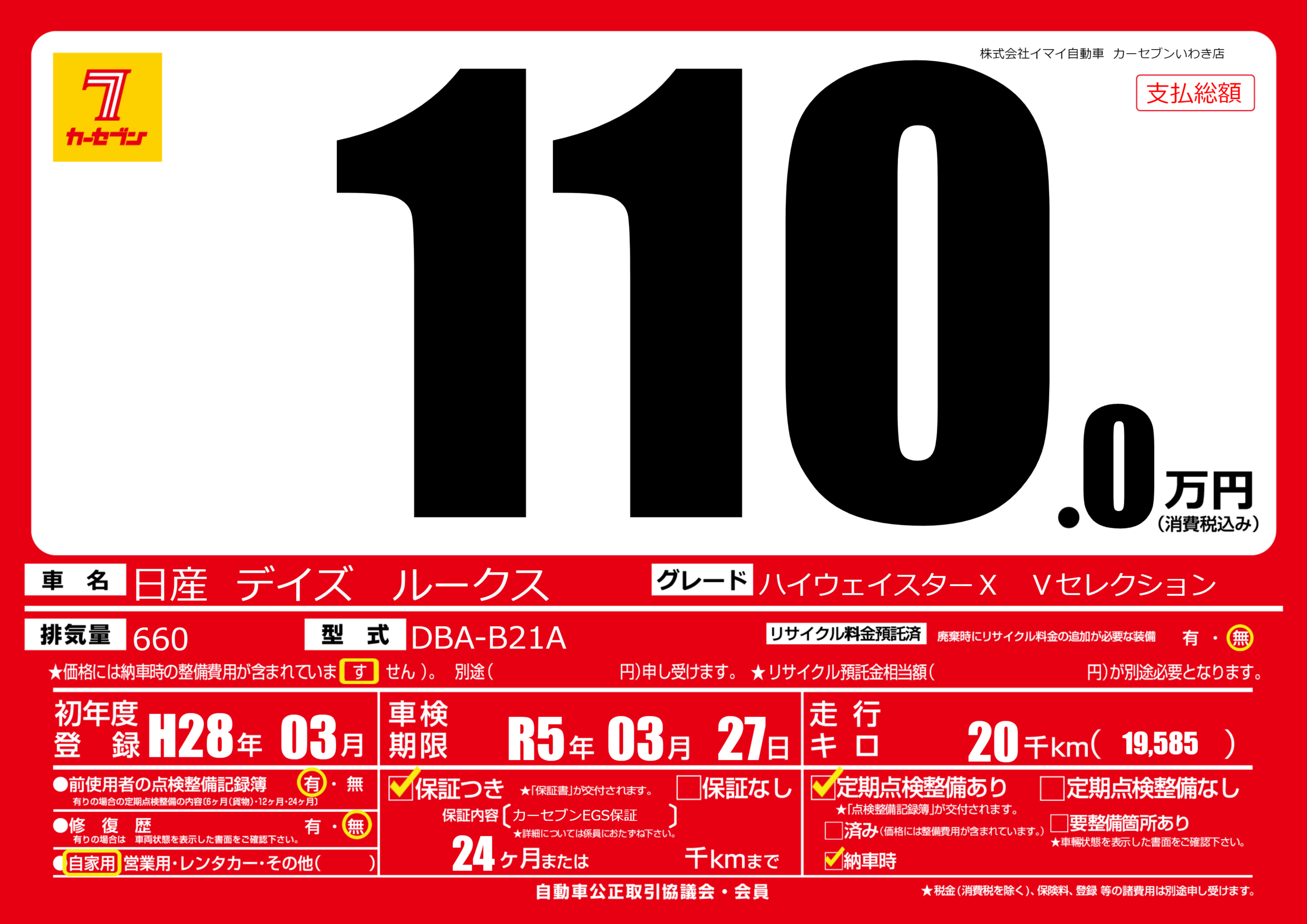 | 車名 | 日産 デイズ ルークス | グレード ミッション 排気量 |