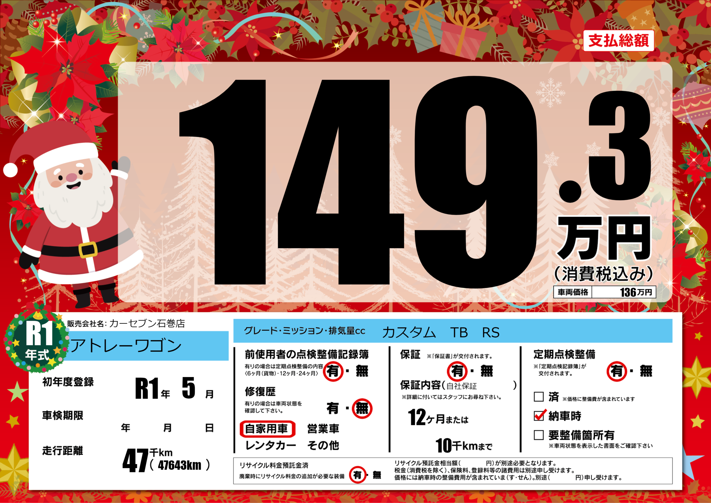 | 定期点検整備 | 定期点検整備あり 納車時あり | ||