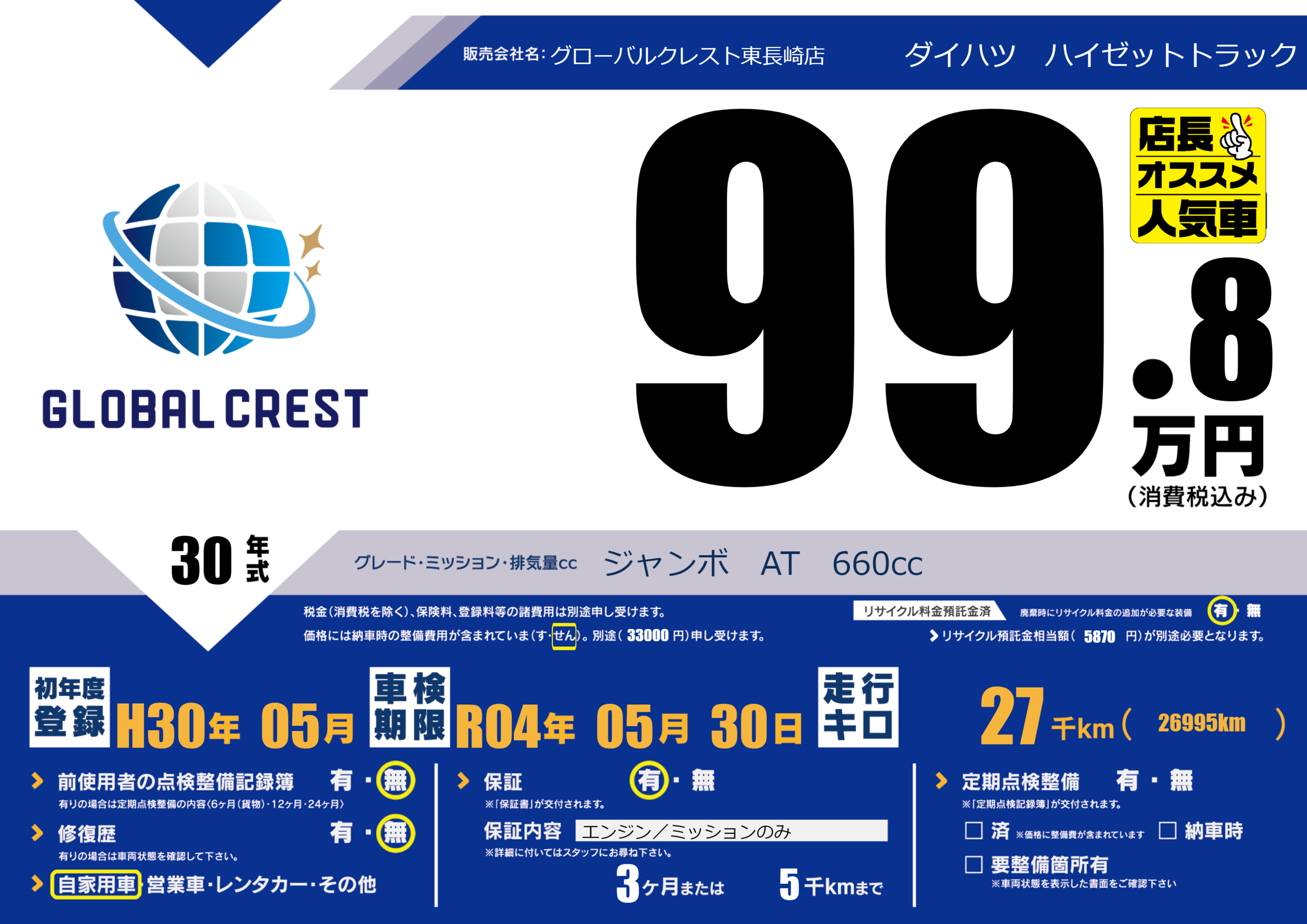 | 車名 | ダイハツ ハイゼットトラック | グレード ミッション 排気量 |