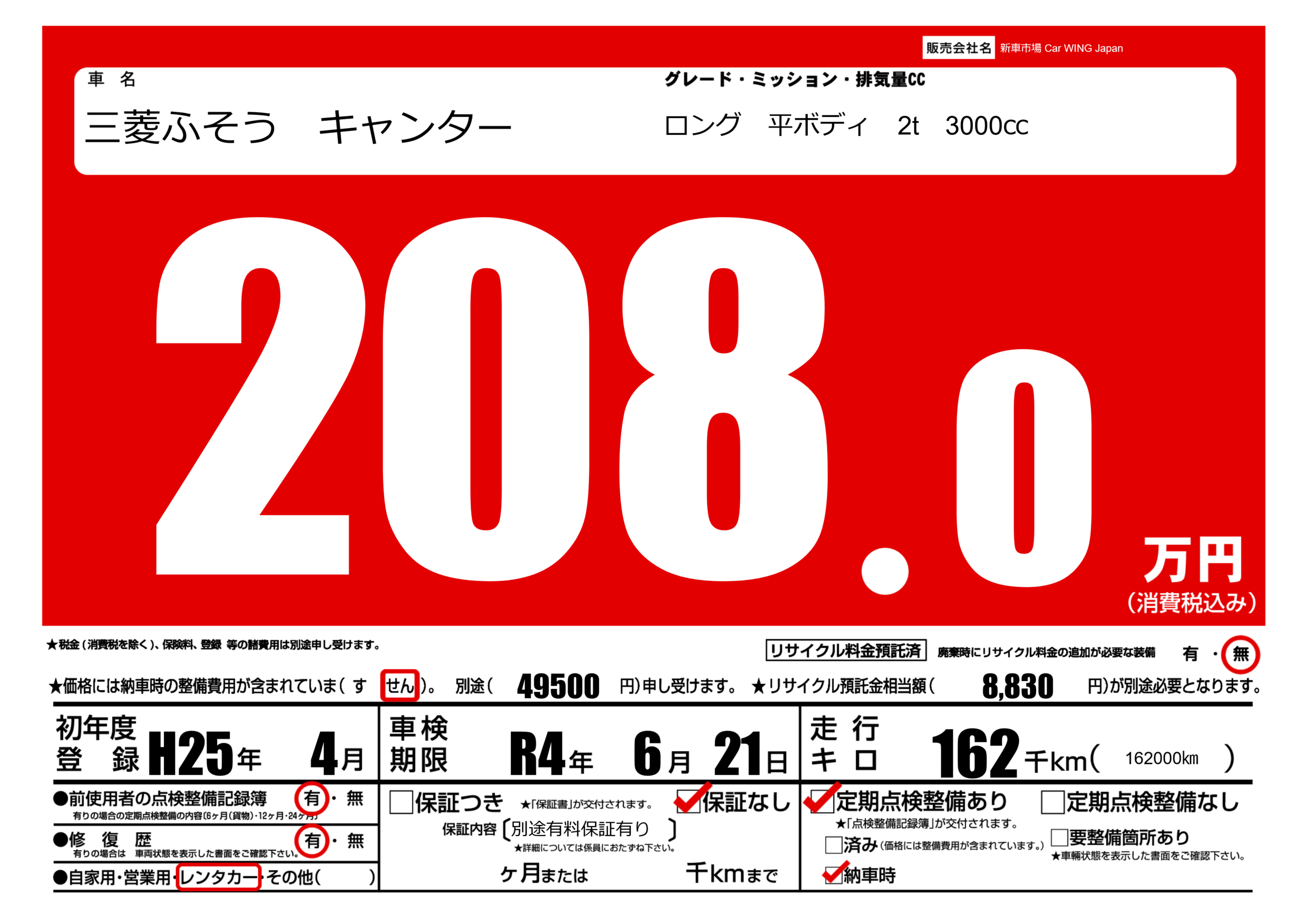保証なし 保証内容(別途有料保証有り) ---ヶ月または()千kmまで |