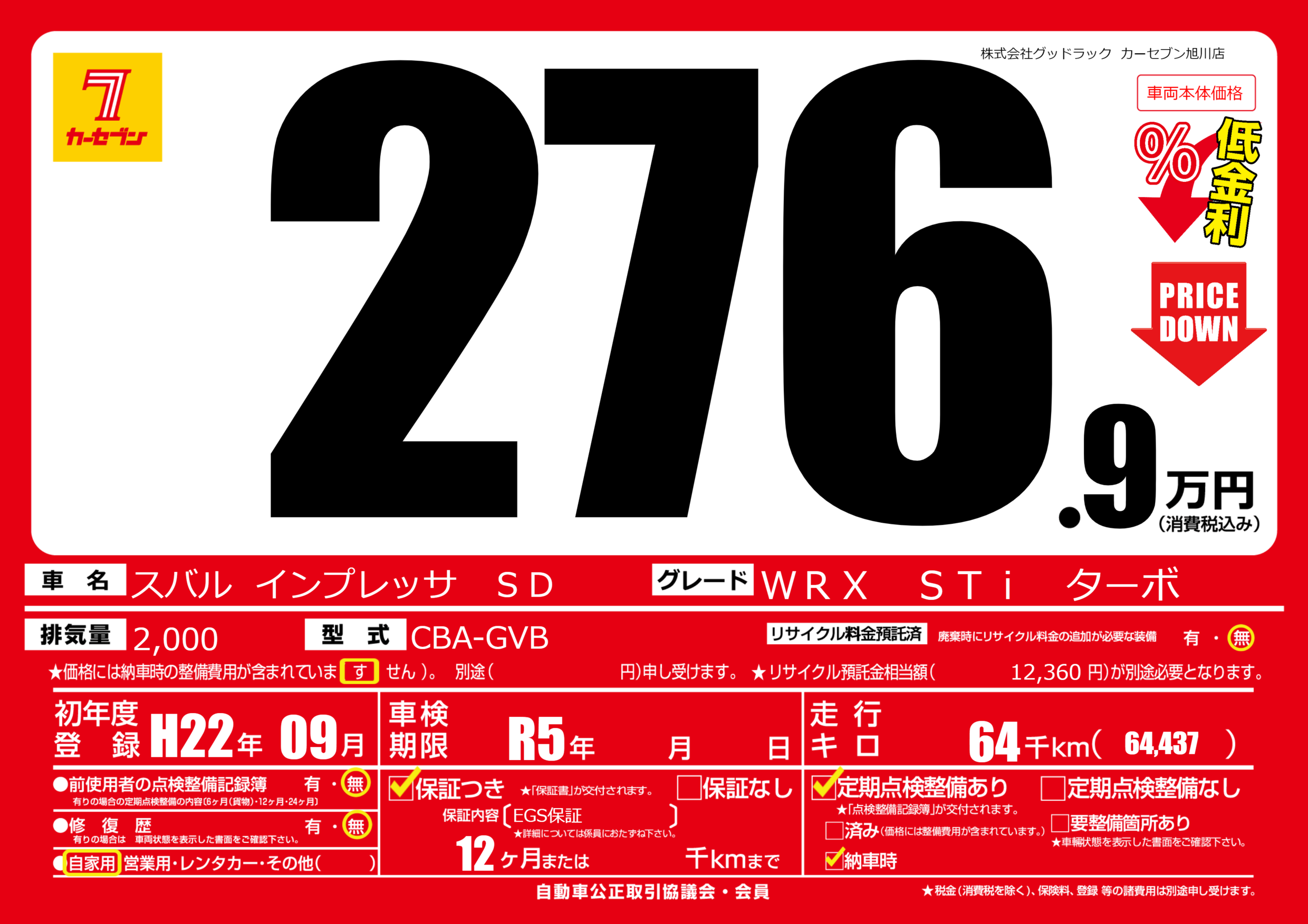 | 走行キロ | 6.4万km | 初年度登録 | H22年09月 |