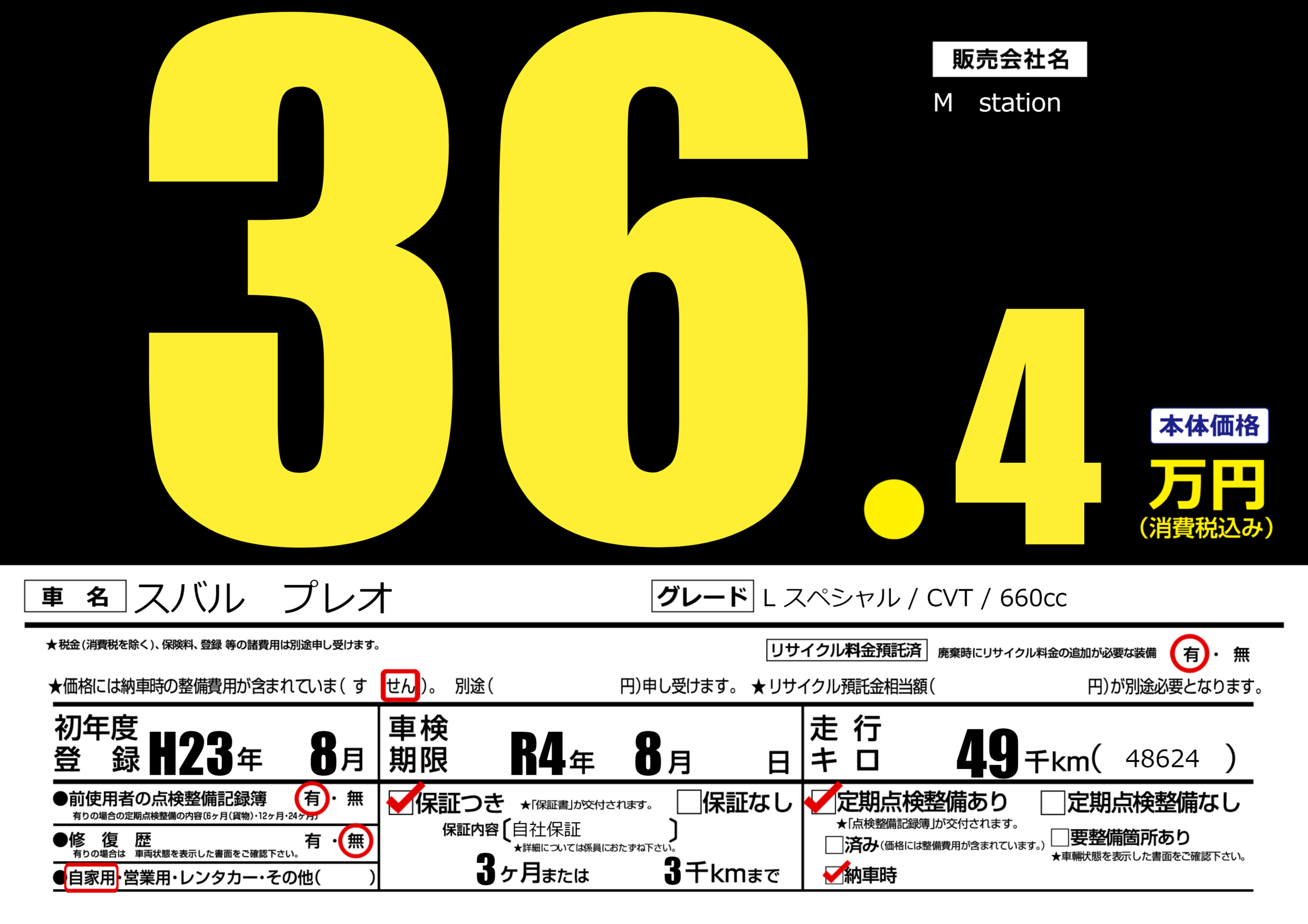 | 車名 | スバル プレオ | グレード ミッション 排気量 |