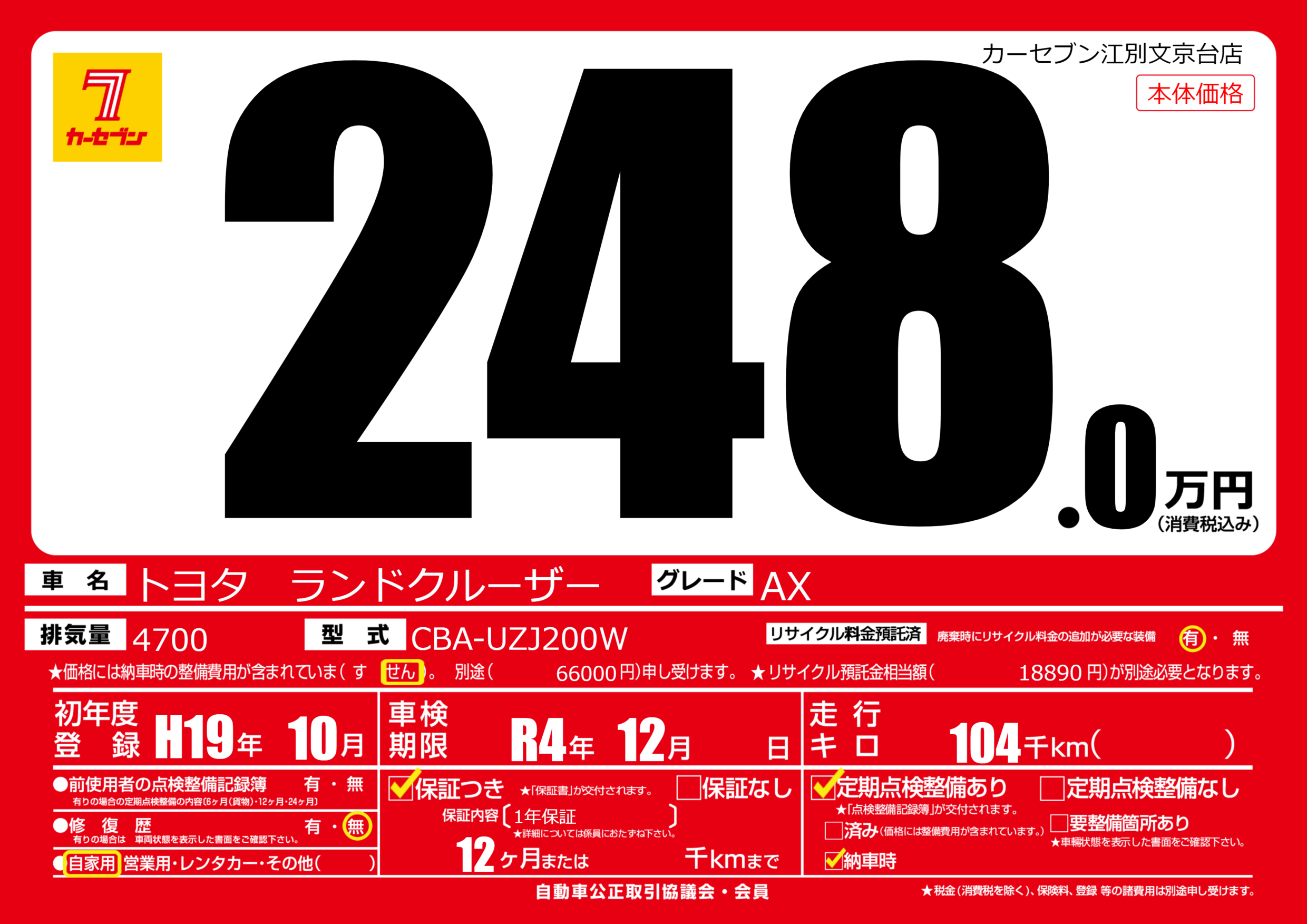 車検制限 | R4年12月---月 |