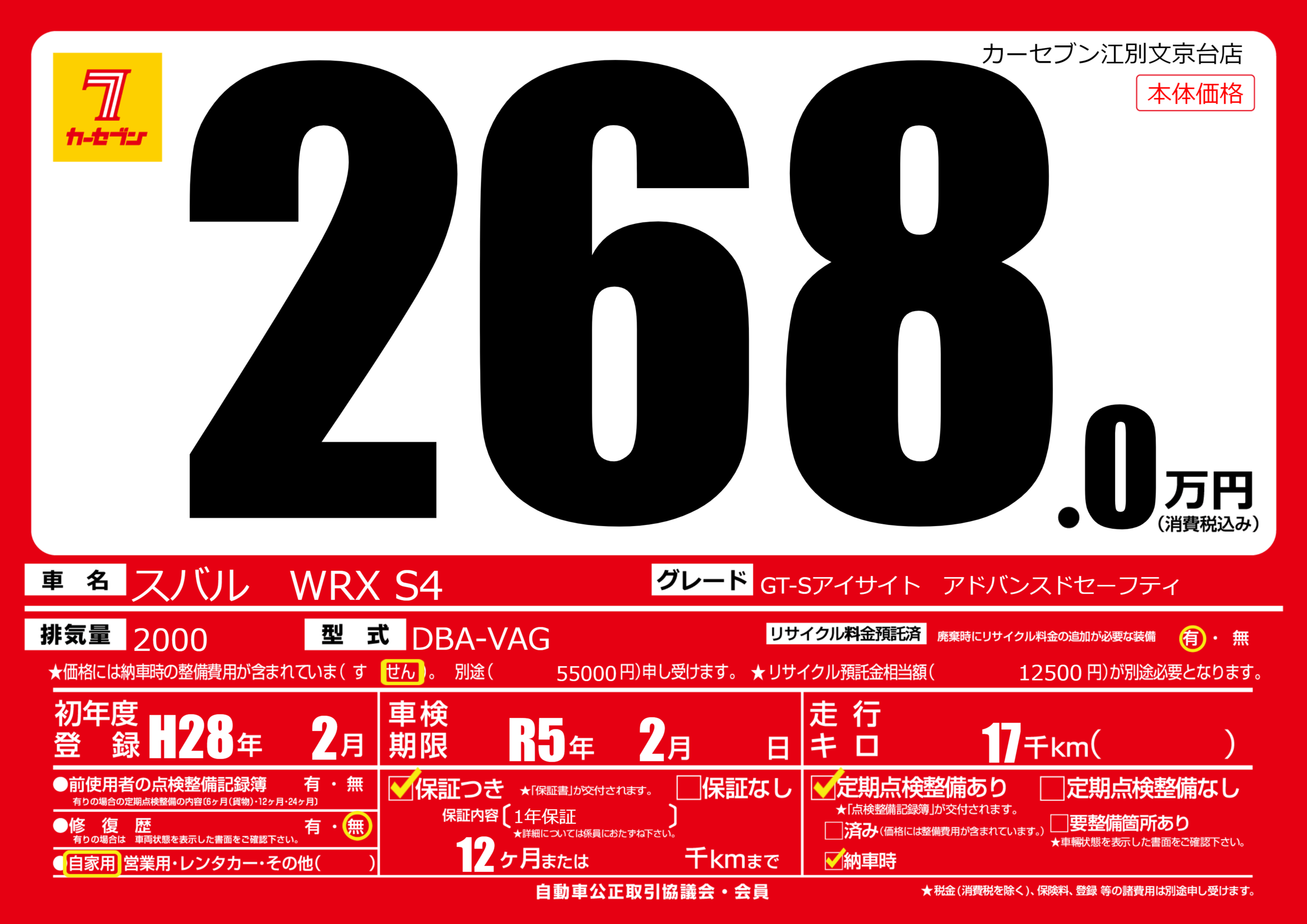 | 車名 | スバル WRX S4 | グレード ミッション 排気量 |