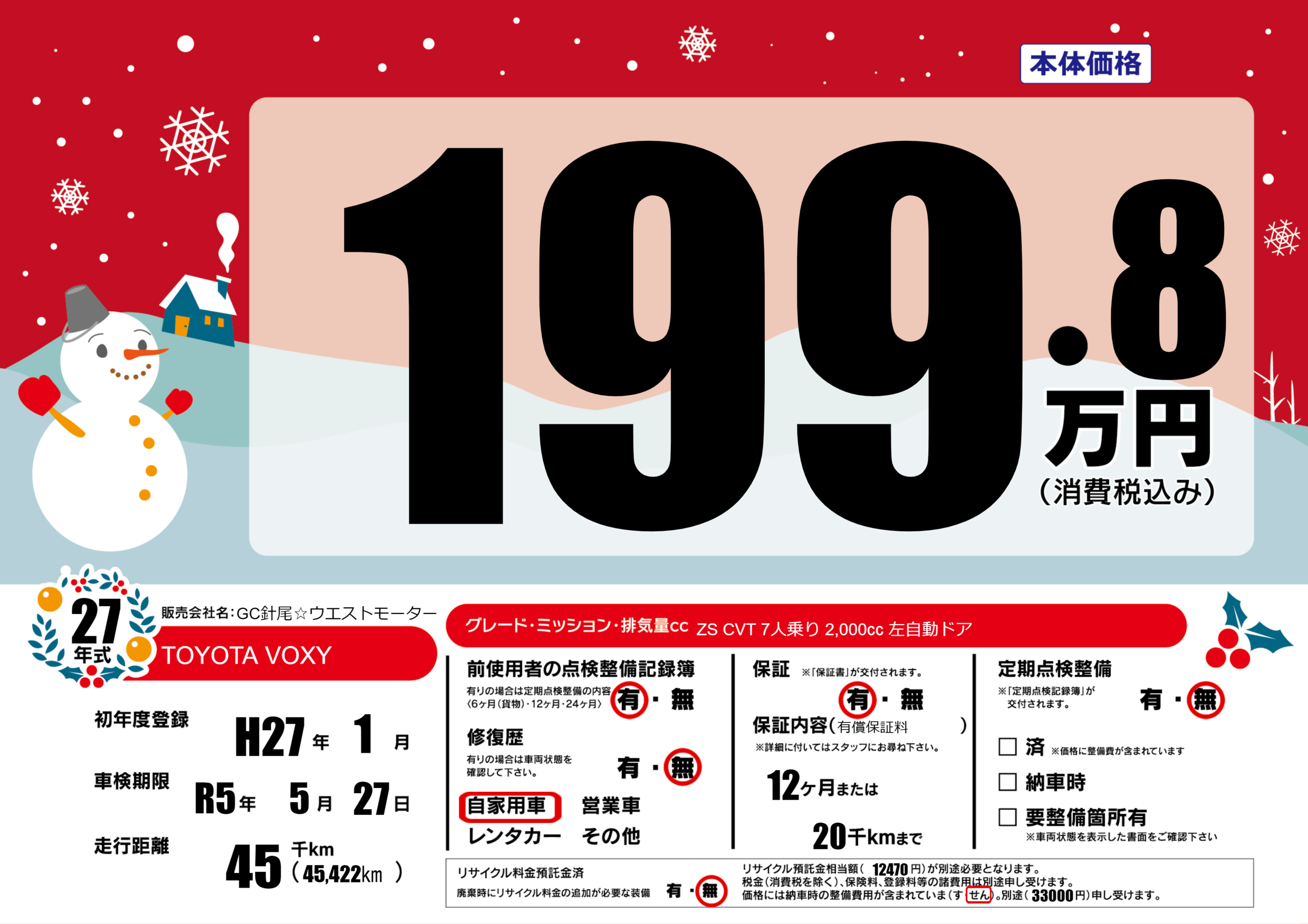 | 車名 | TOYOTA VOXY | グレード ミッション 排気量 |