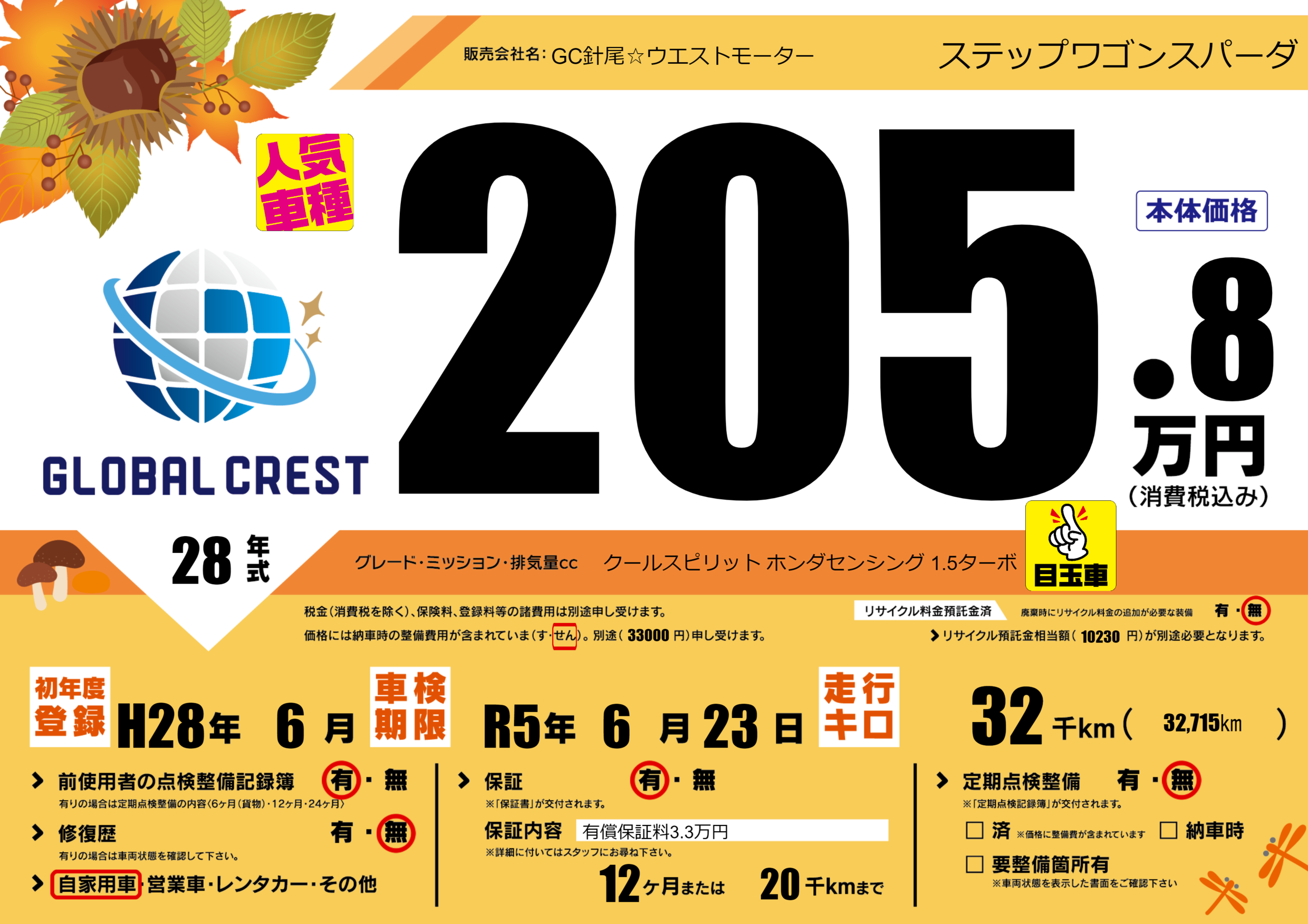 | 走行キロ | 3.2万km | 初年度登録 | H28年6月 |