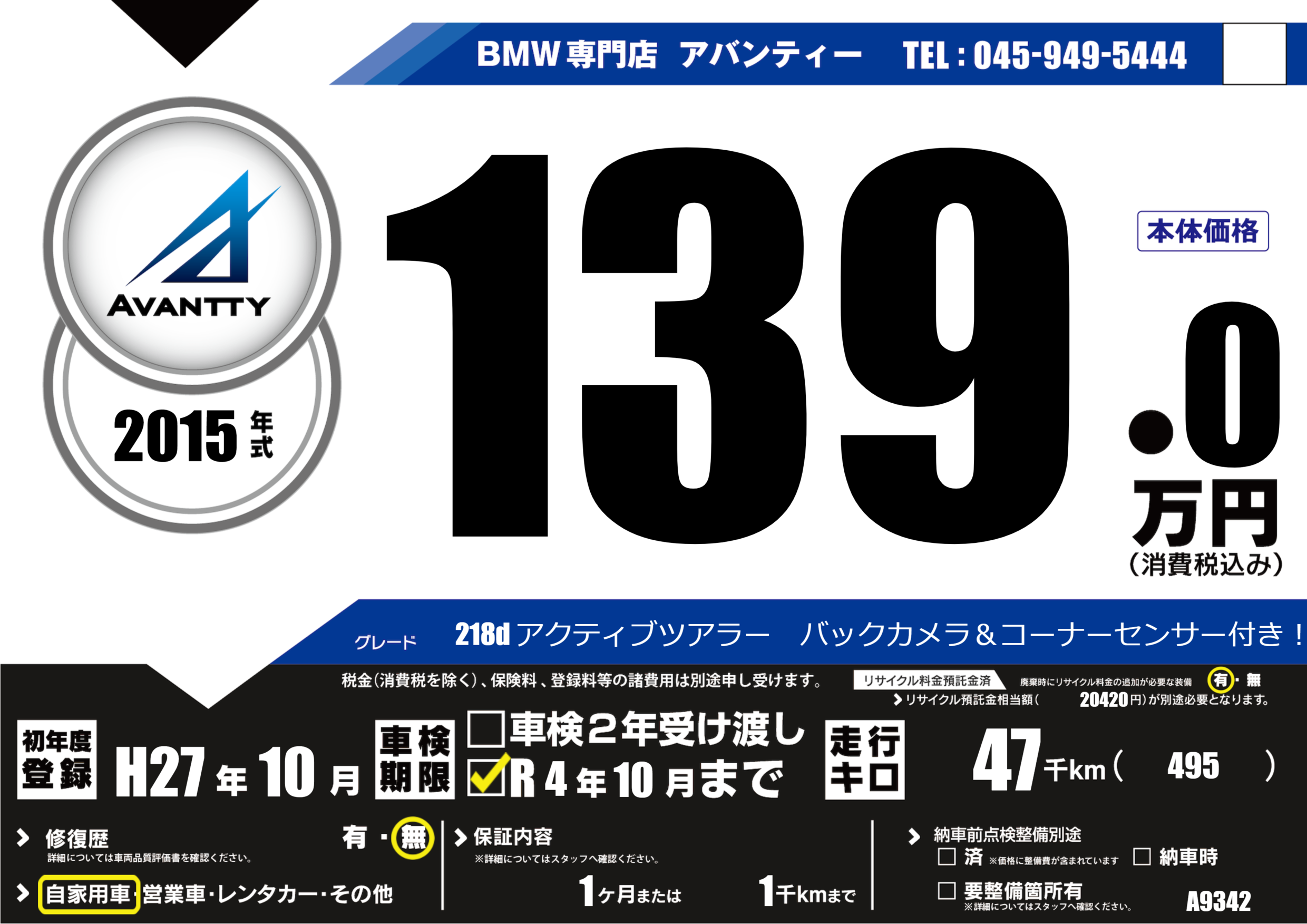 | 走行キロ | 4.7万km | 初年度登録 | H27年10月 |