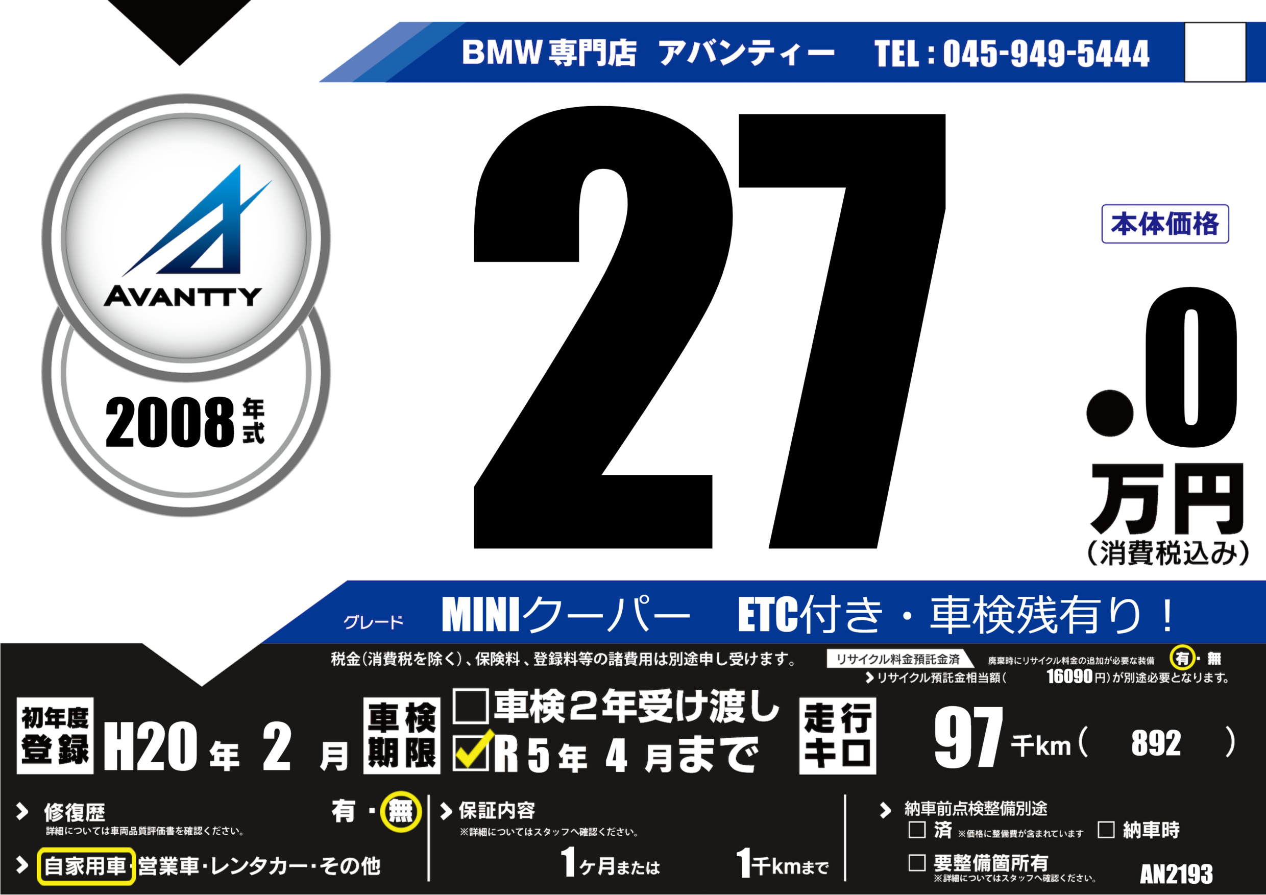 | 走行キロ | 9.7万km | 初年度登録 | H20年2月 |