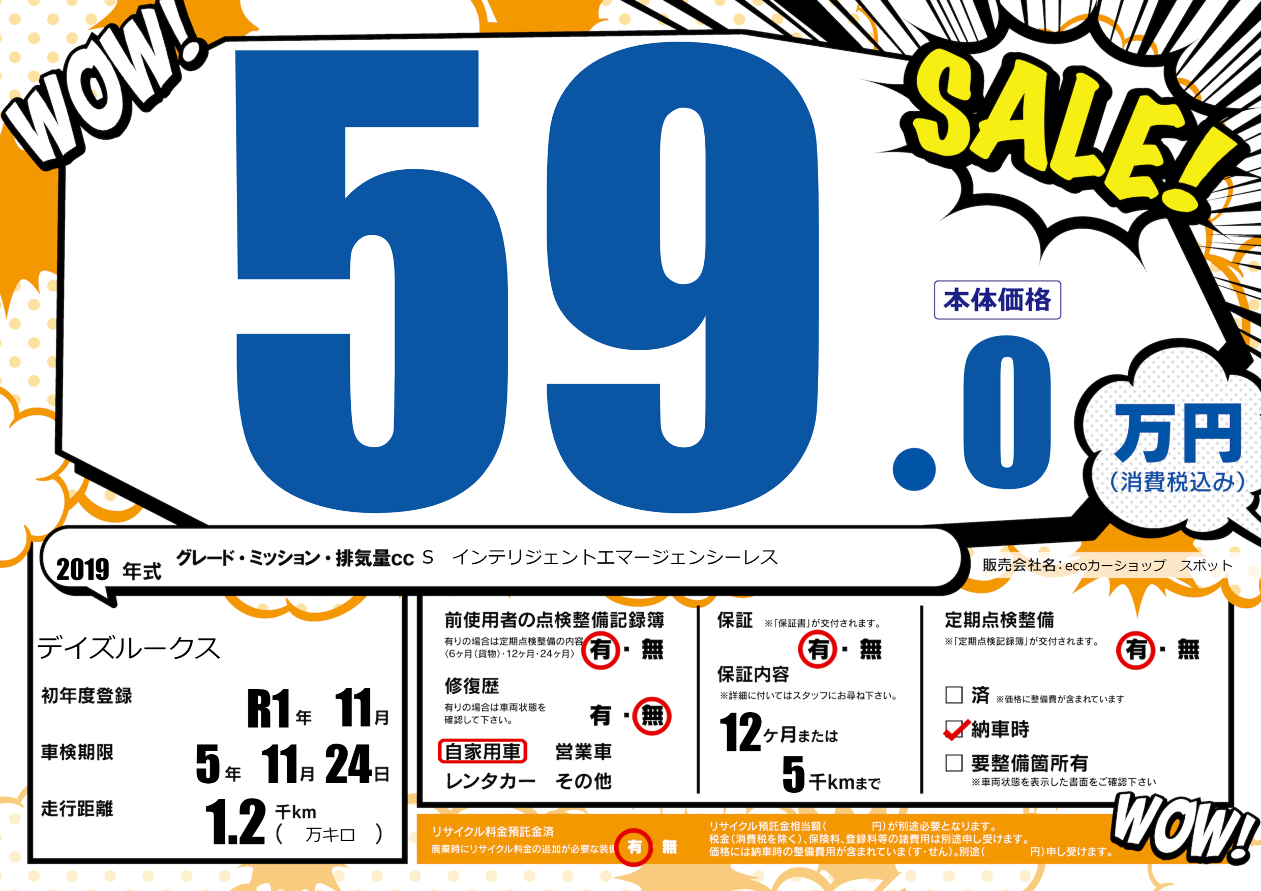 | 走行キロ | 0.1万km | 初年度登録 | R1年11月 |