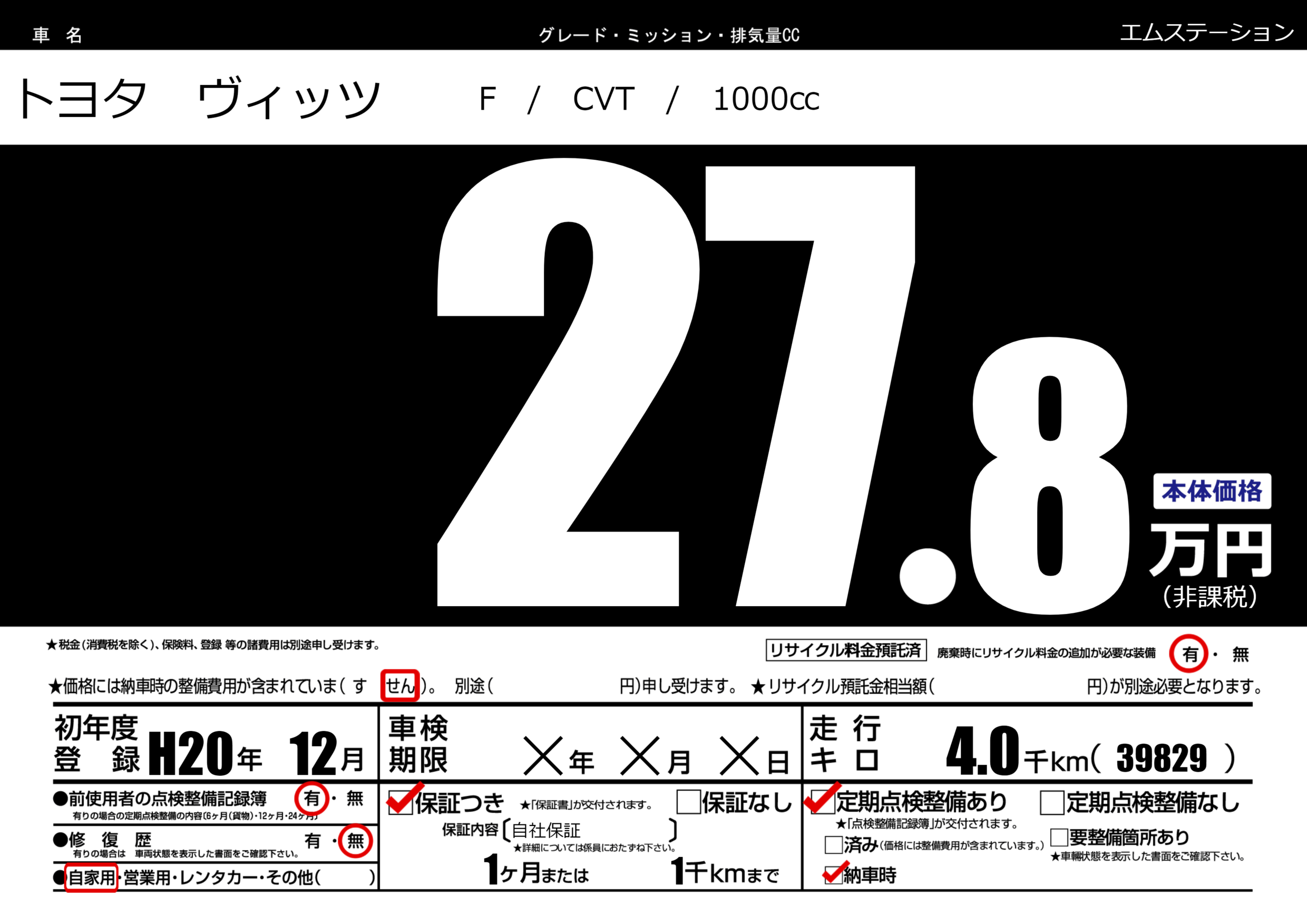| 車名 | トヨタ ヴィッツ | グレード ミッション 排気量 |