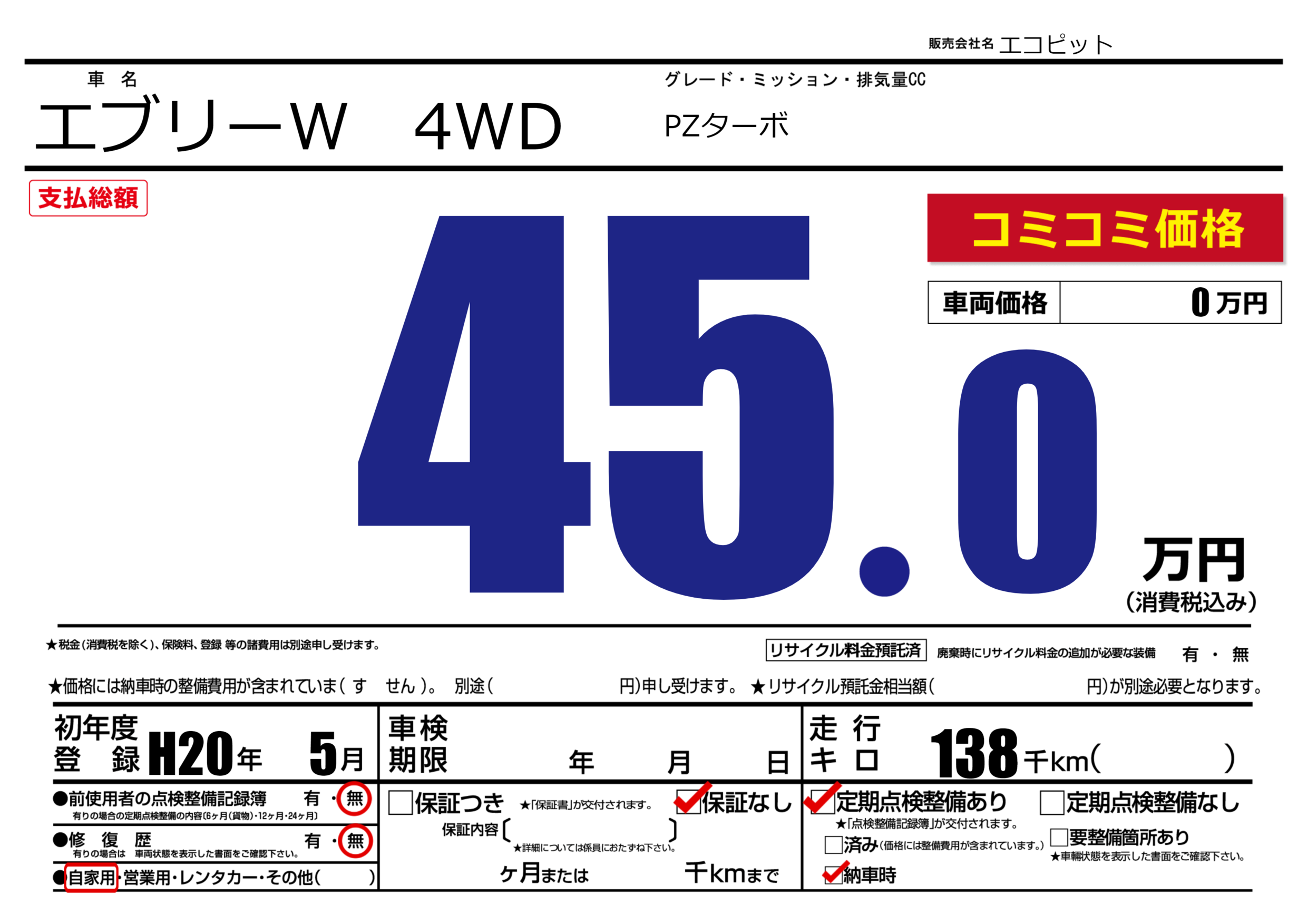 | 車名 | エブリーW 4WD | グレード ミッション 排気量 |