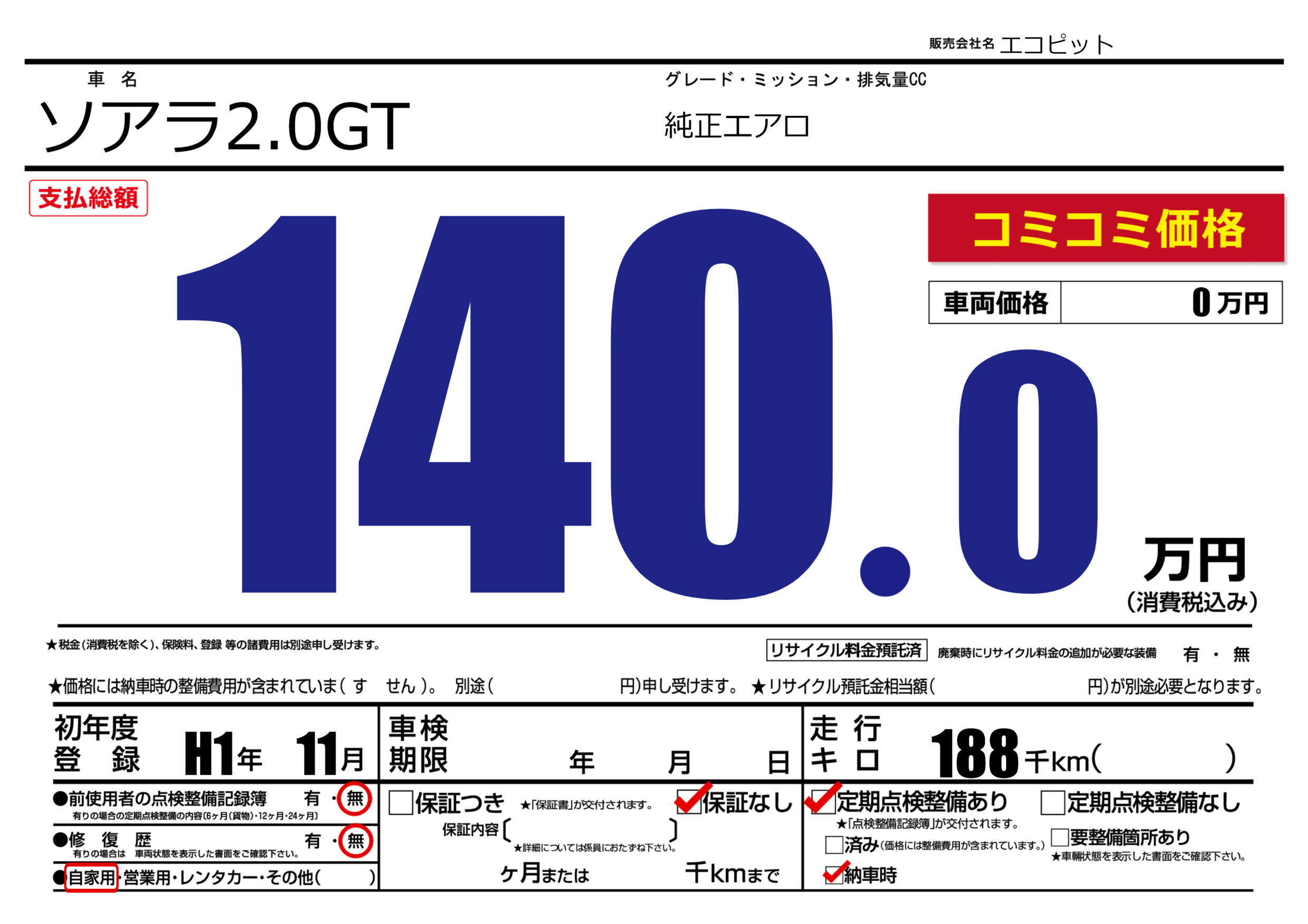 | 車名 | ソアラ2.0GT | グレード ミッション 排気量 |