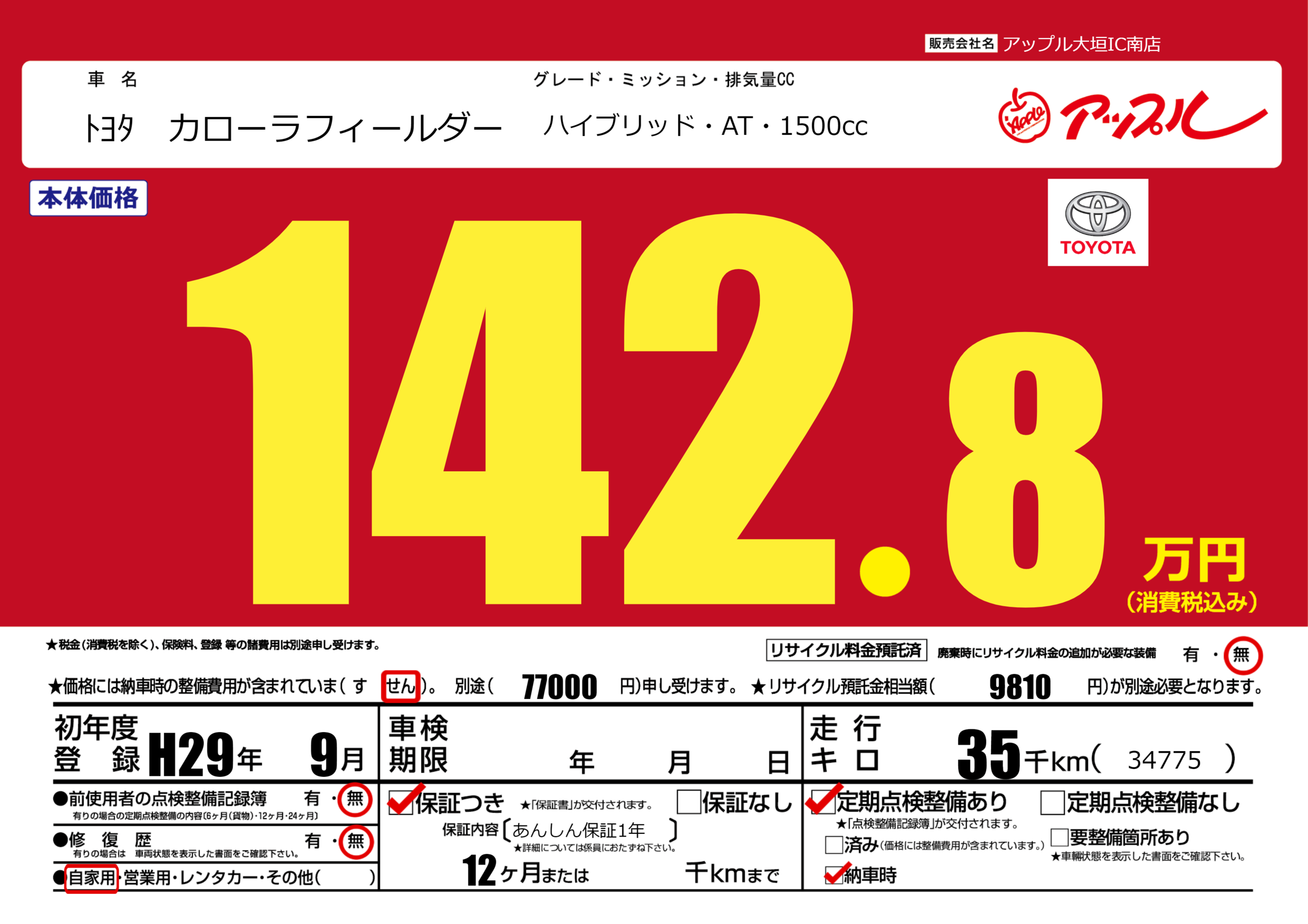 | 車名 | トヨタ カローラフィールダー | グレード ミッション 排気量 |