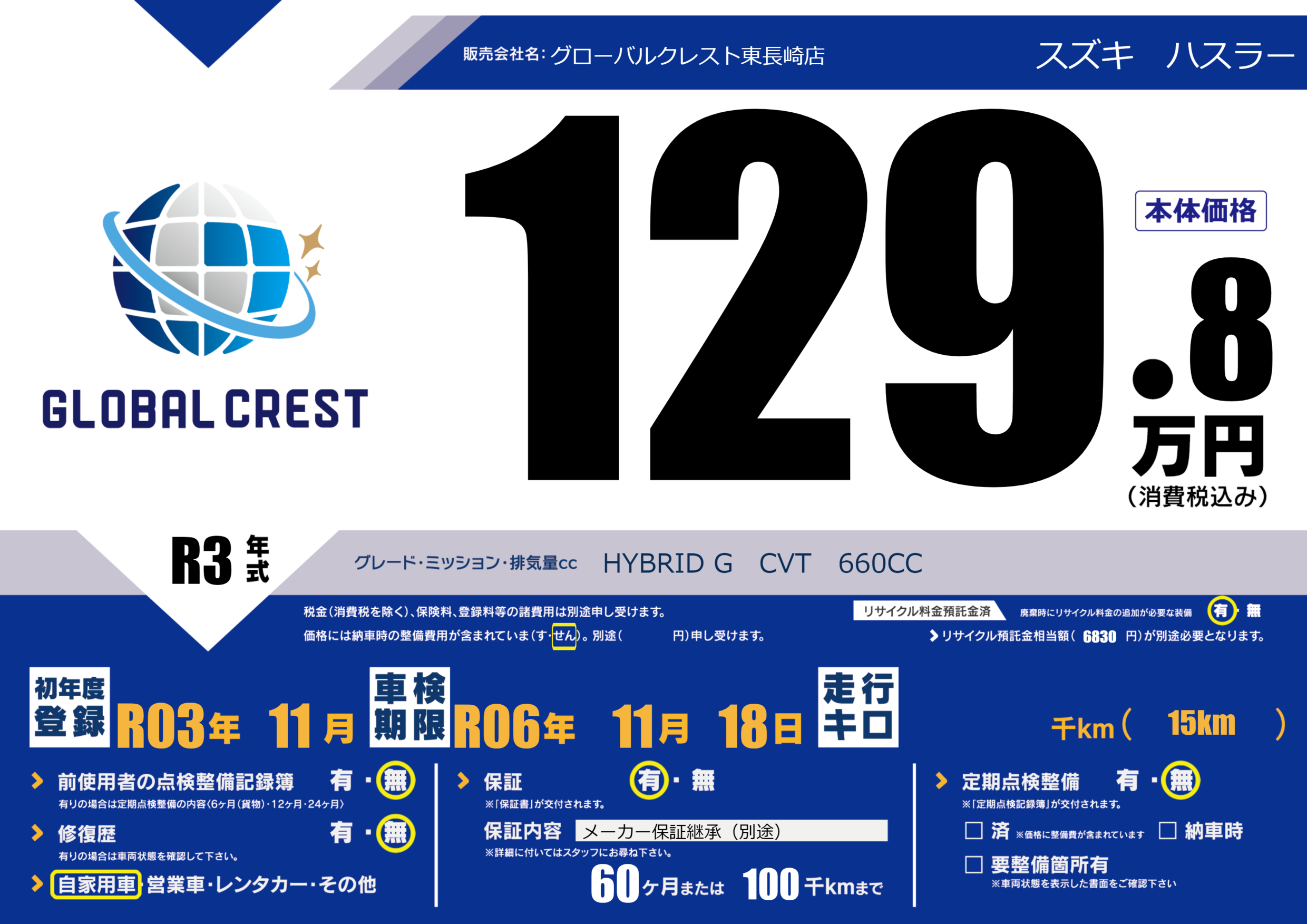 | 車名 | スズキ ハスラー | グレード ミッション 排気量 |