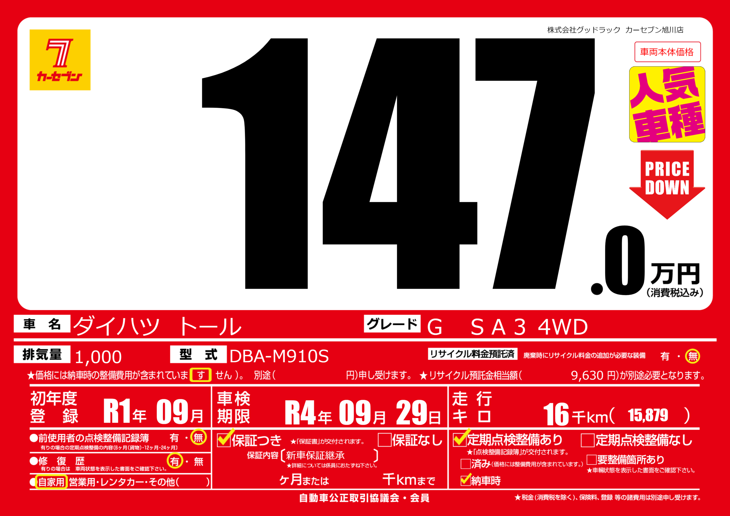 | 車名 | ダイハツ トール | グレード ミッション 排気量 |