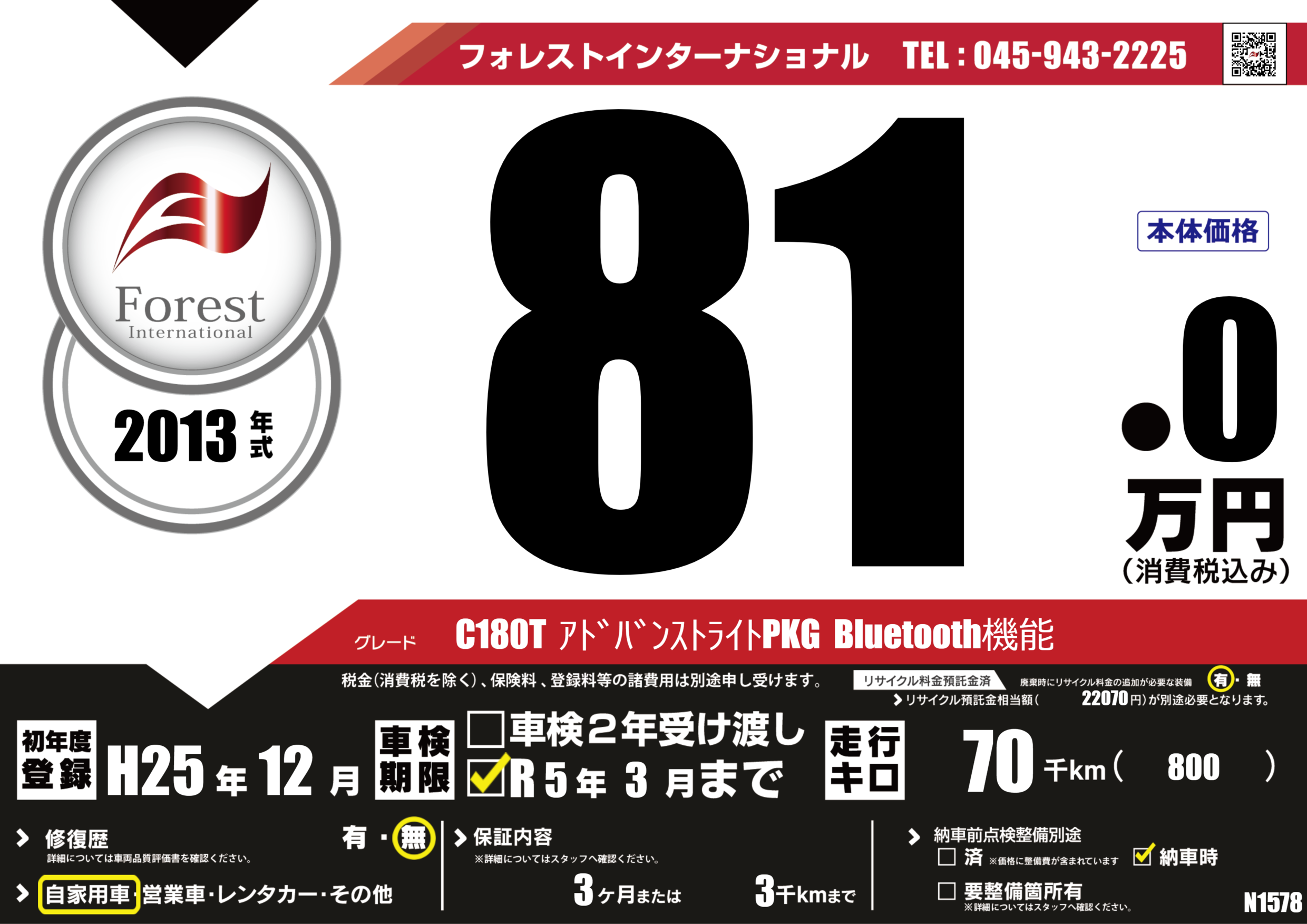 | 走行キロ | 7万km | 初年度登録 | H25年12月 |