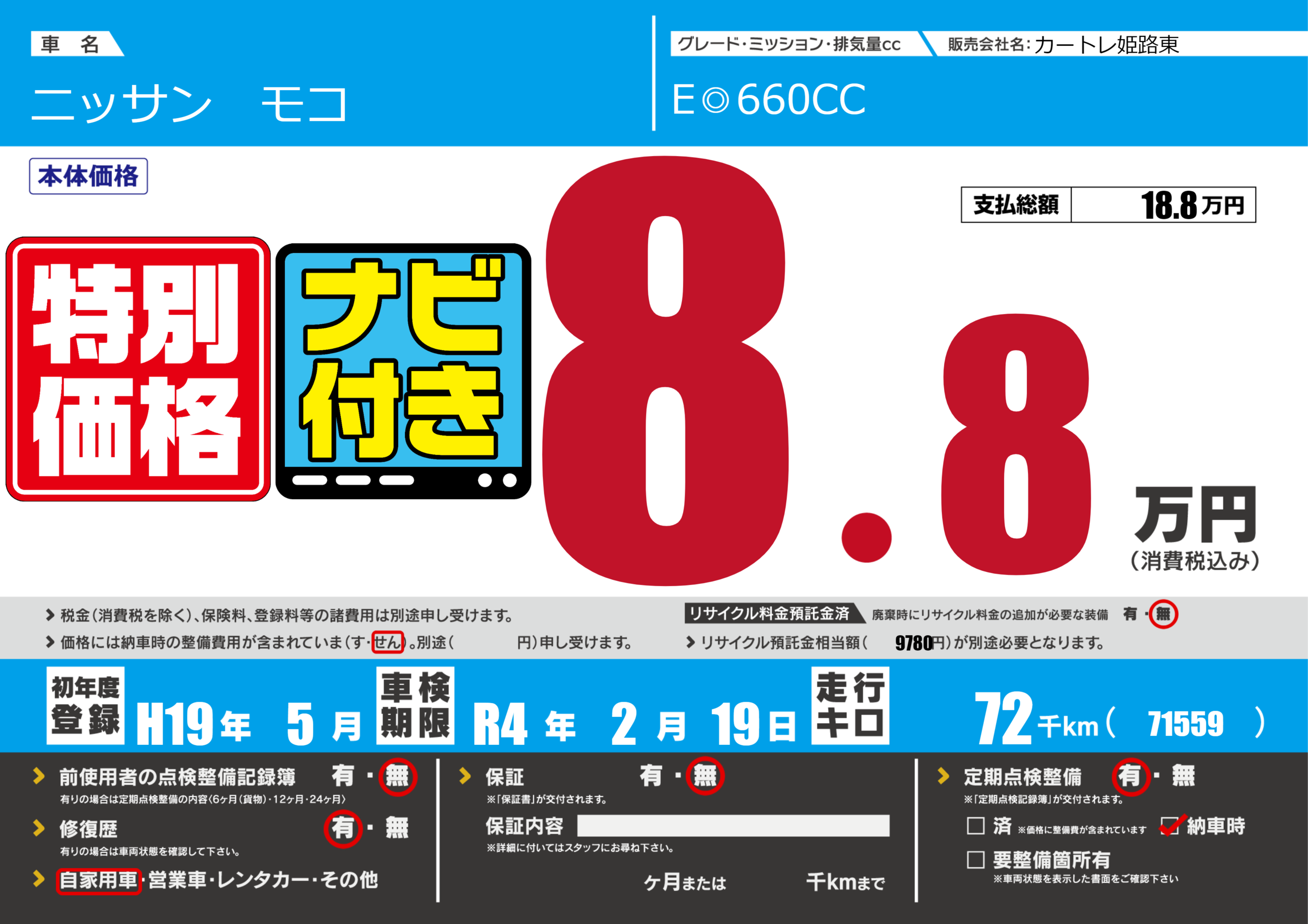 | 車名 | ニッサン モコ | グレード ミッション 排気量 |