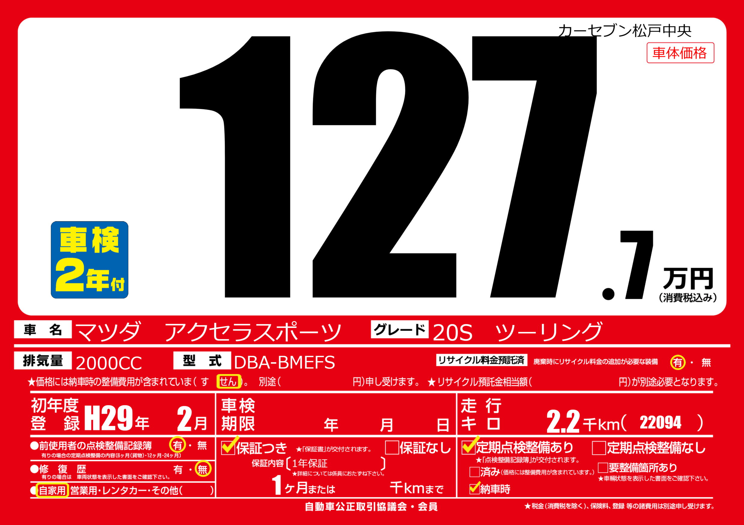 | 車名 | マツダ アクセラスポーツ | グレード ミッション 排気量 |