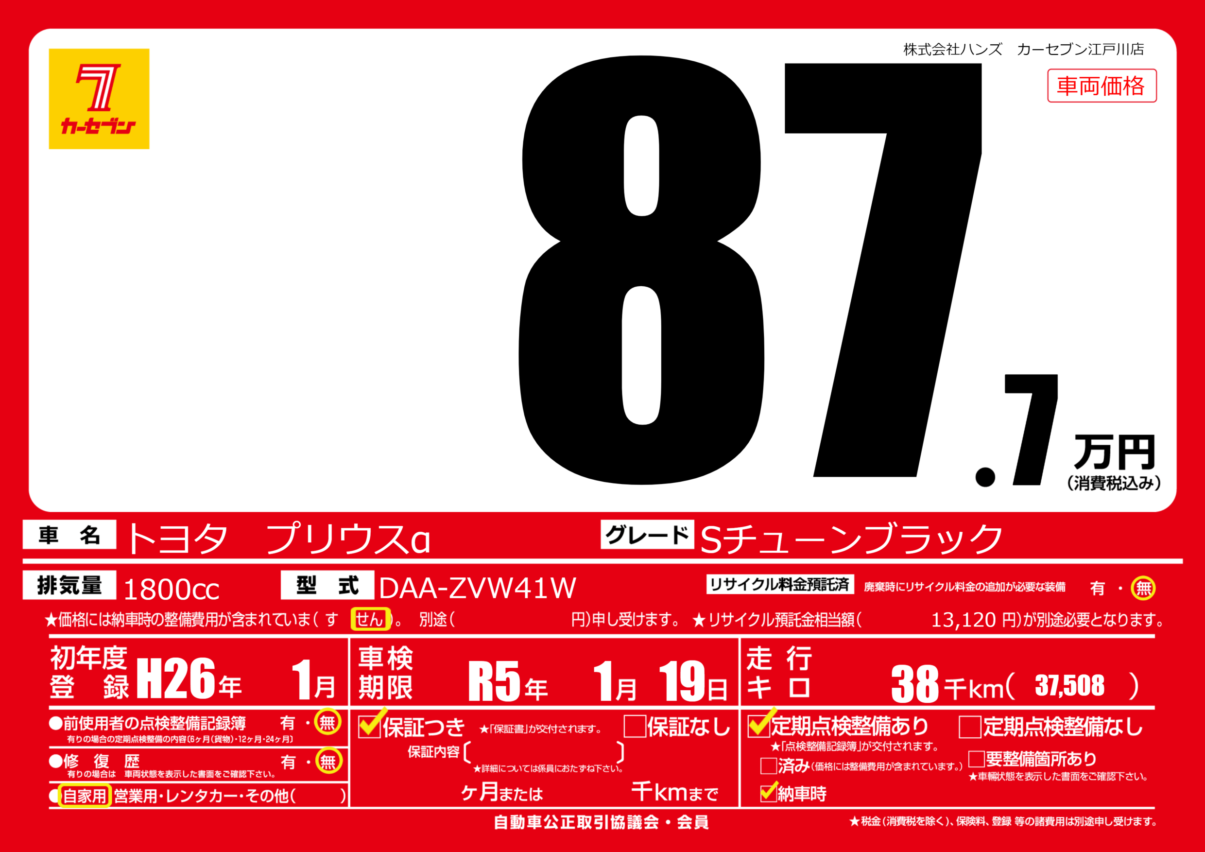| 車名 | トヨタ プリウスα | グレード ミッション 排気量 |