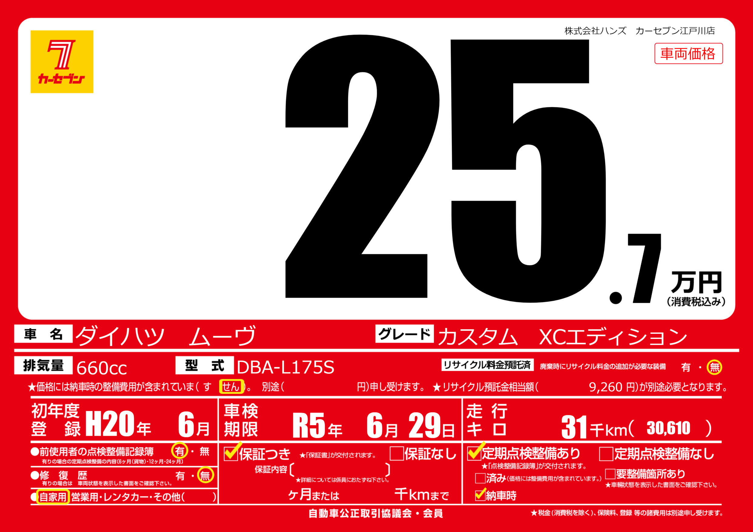 | 走行キロ | 3.1万km | 初年度登録 | H20年6月 |