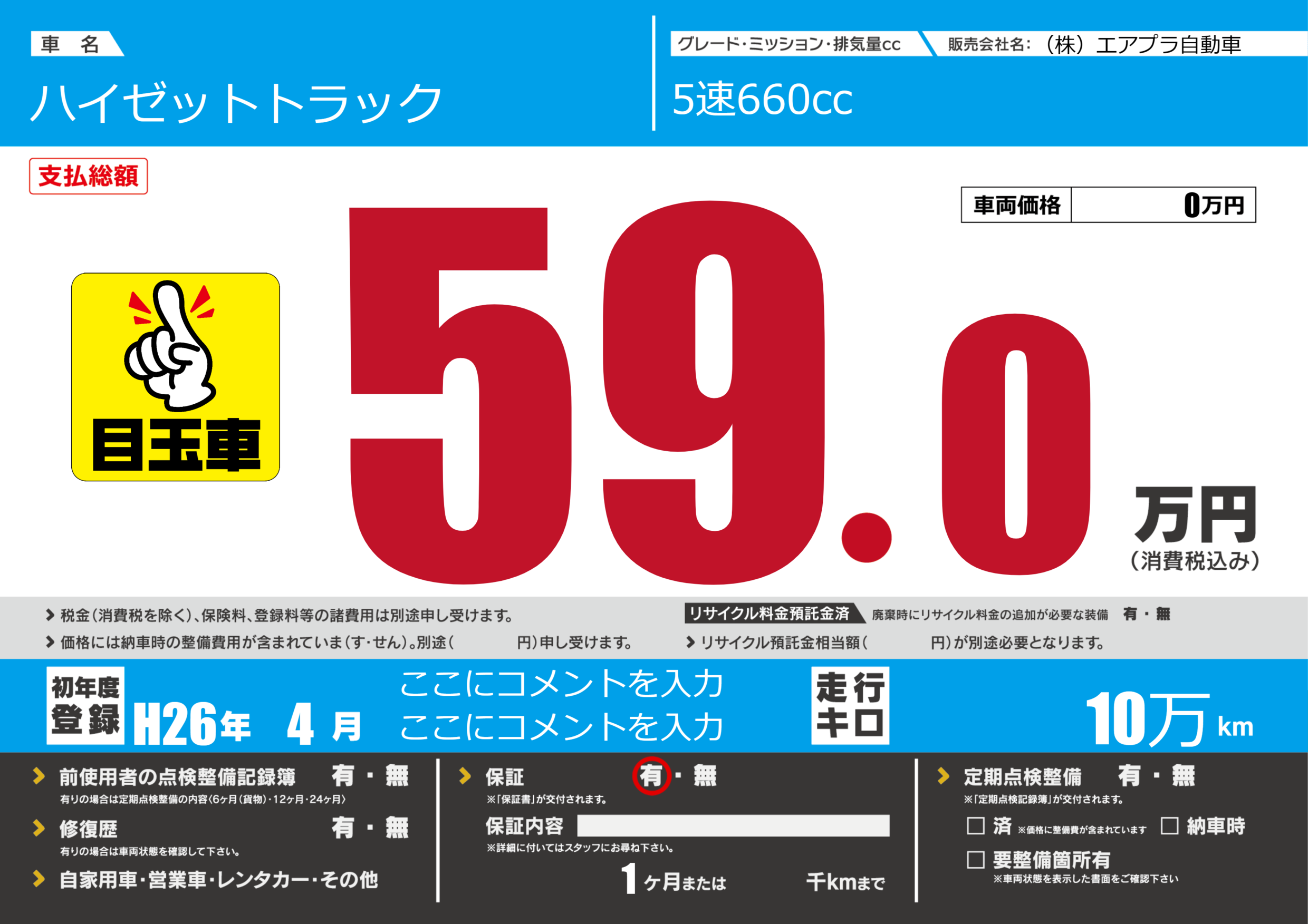 保証付き 保証内容(---) 1ヶ月または()千kmまで |