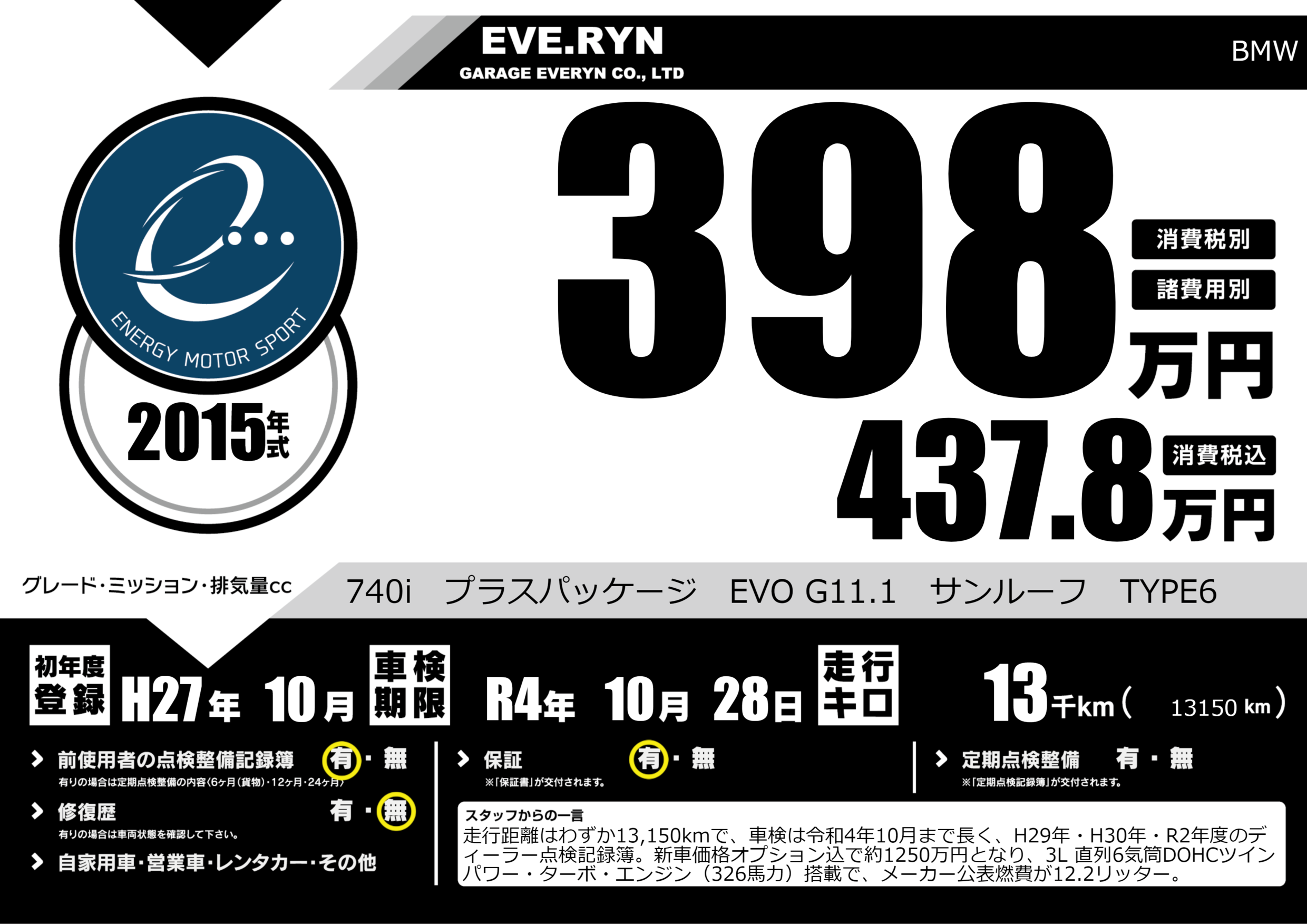 740i プラスパッケージ EVO G11.1 サンルーフ TYPE6 |