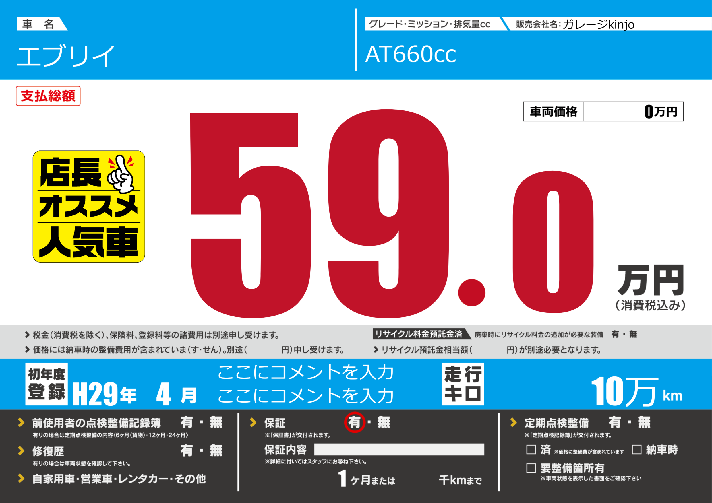 | 車名 | エブリイ | グレード ミッション 排気量 |