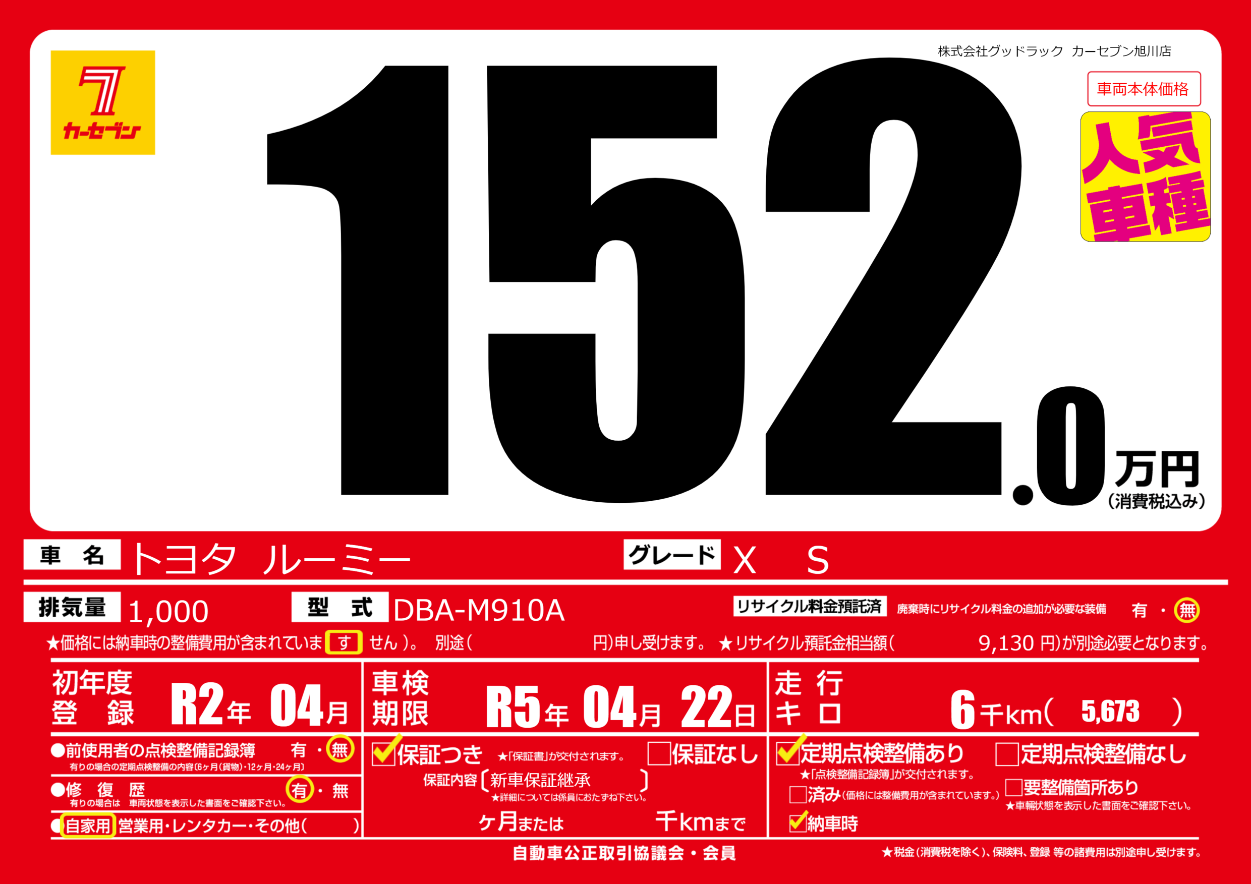 | 車名 | トヨタ ルーミー | グレード ミッション 排気量 |