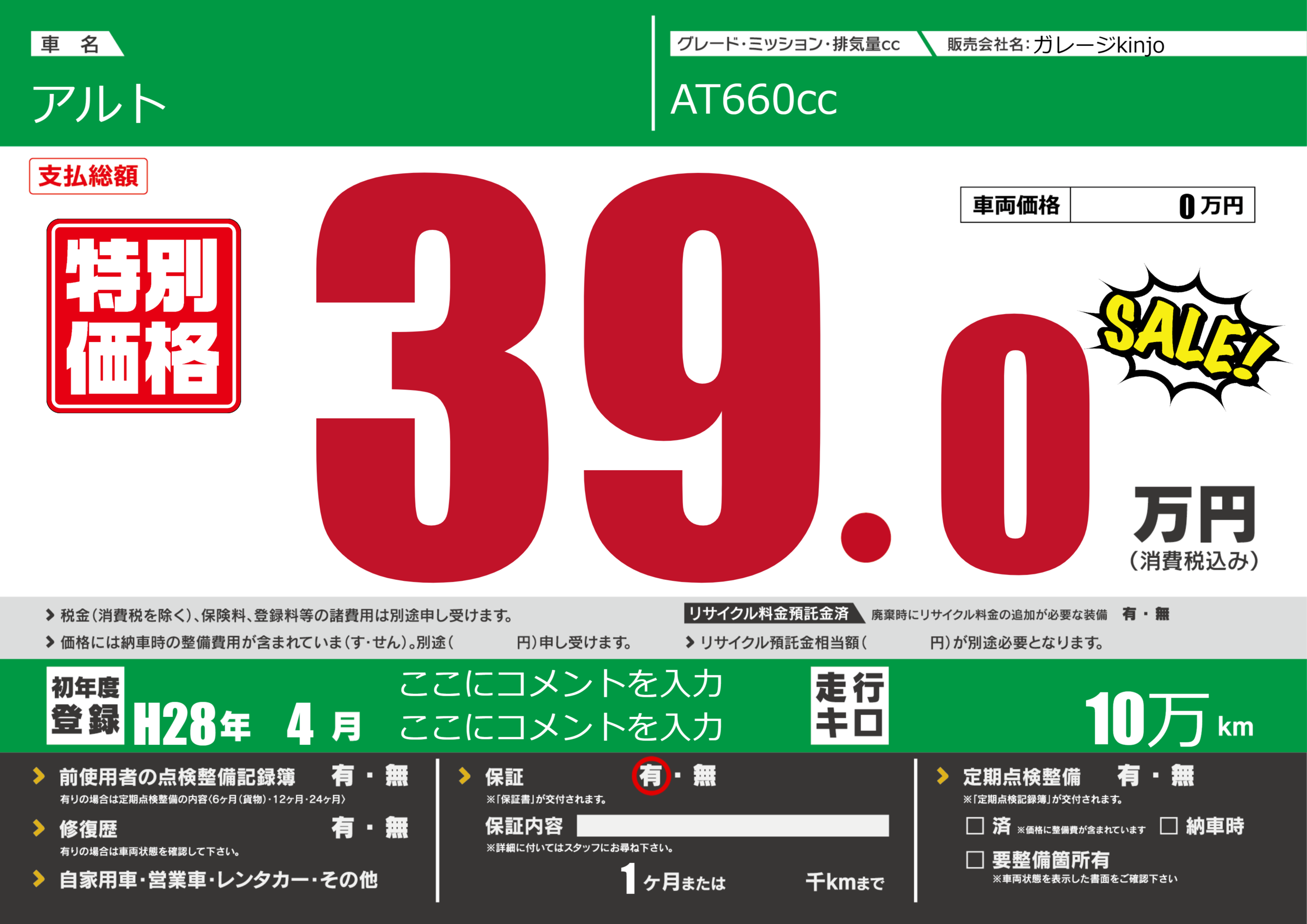 保証付き 保証内容(---) 1ヶ月または()千kmまで |