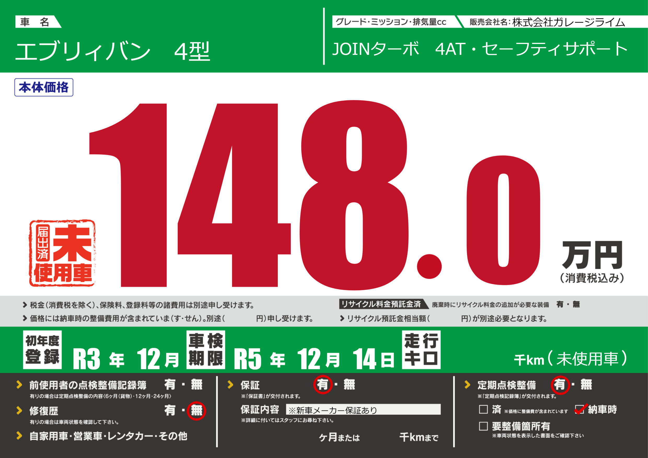 | 車名 | エブリィバン 4型 | グレード ミッション 排気量 |