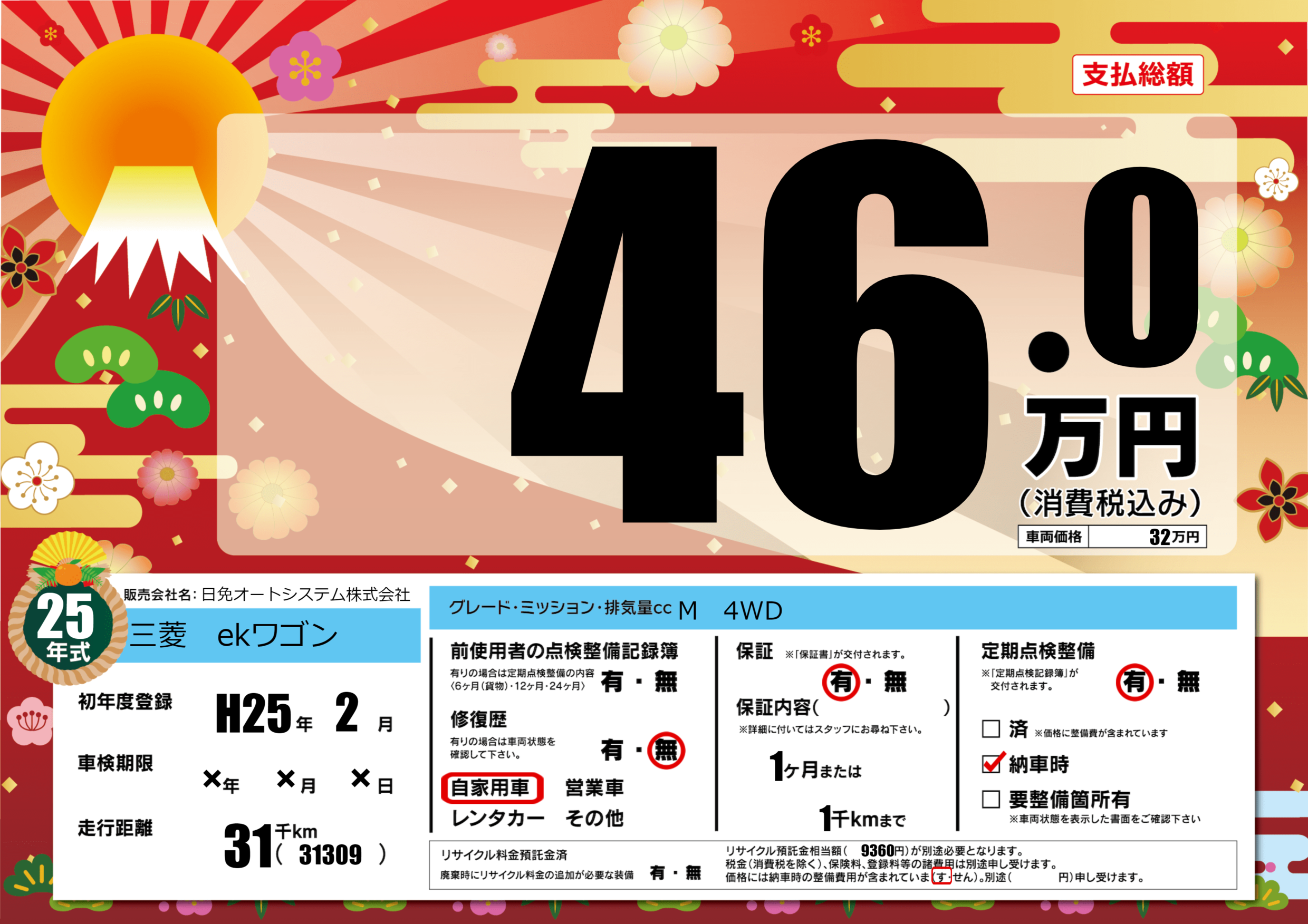 | 走行キロ | 3.1万km | 初年度登録 | H25年2月 |