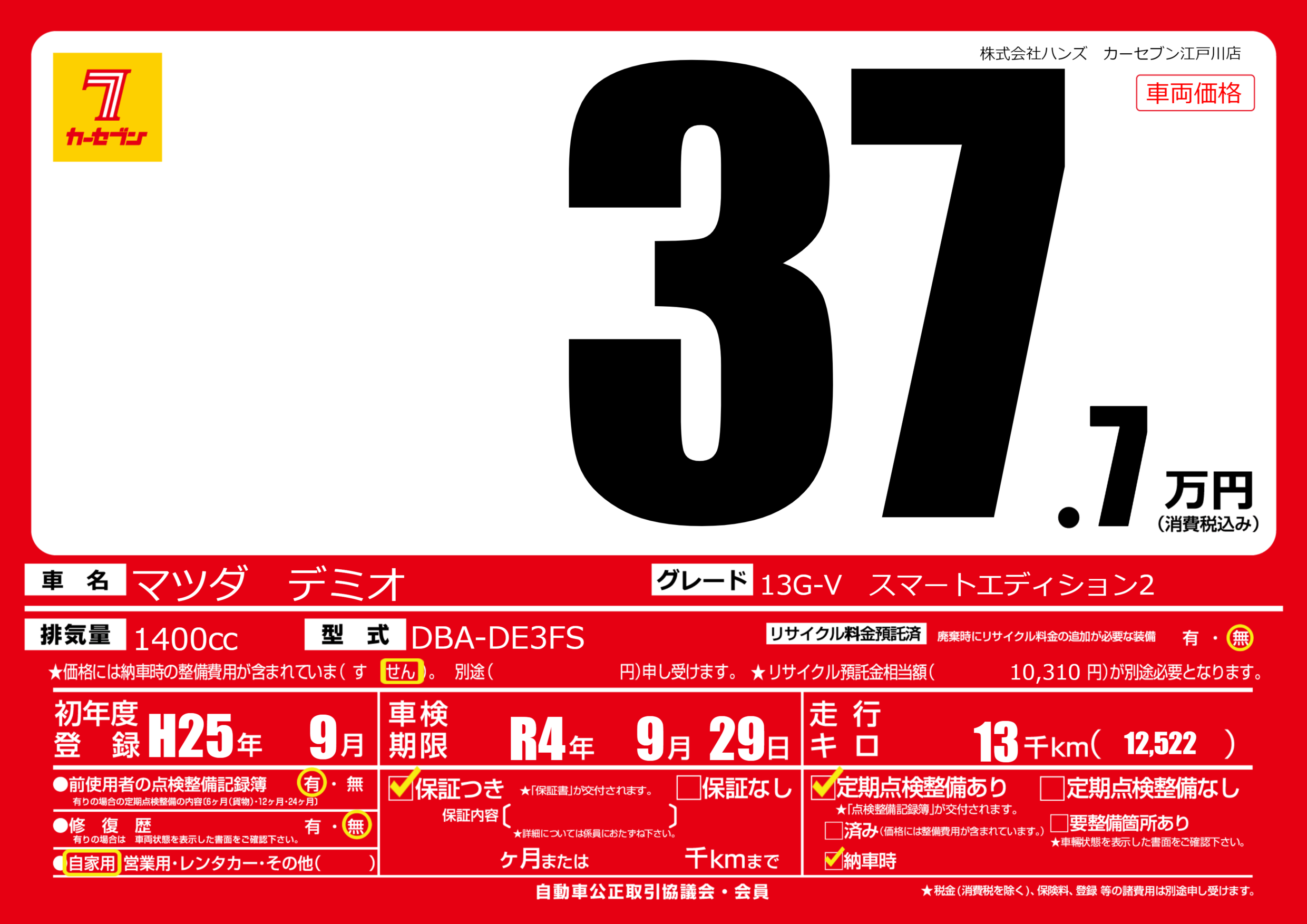 | 車名 | マツダ デミオ | グレード ミッション 排気量 |