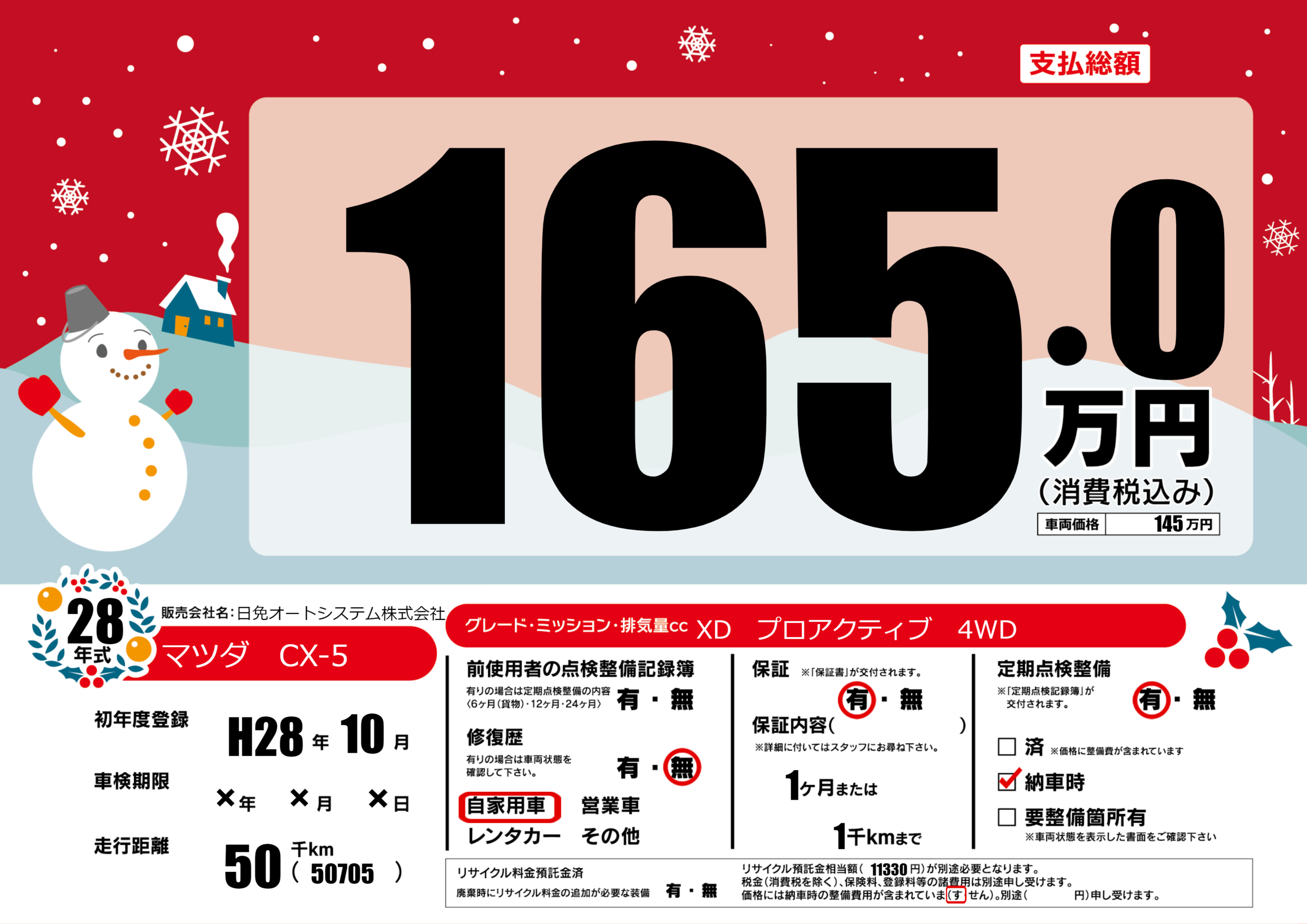 | 走行キロ | 5万km | 初年度登録 | H28年10月 |