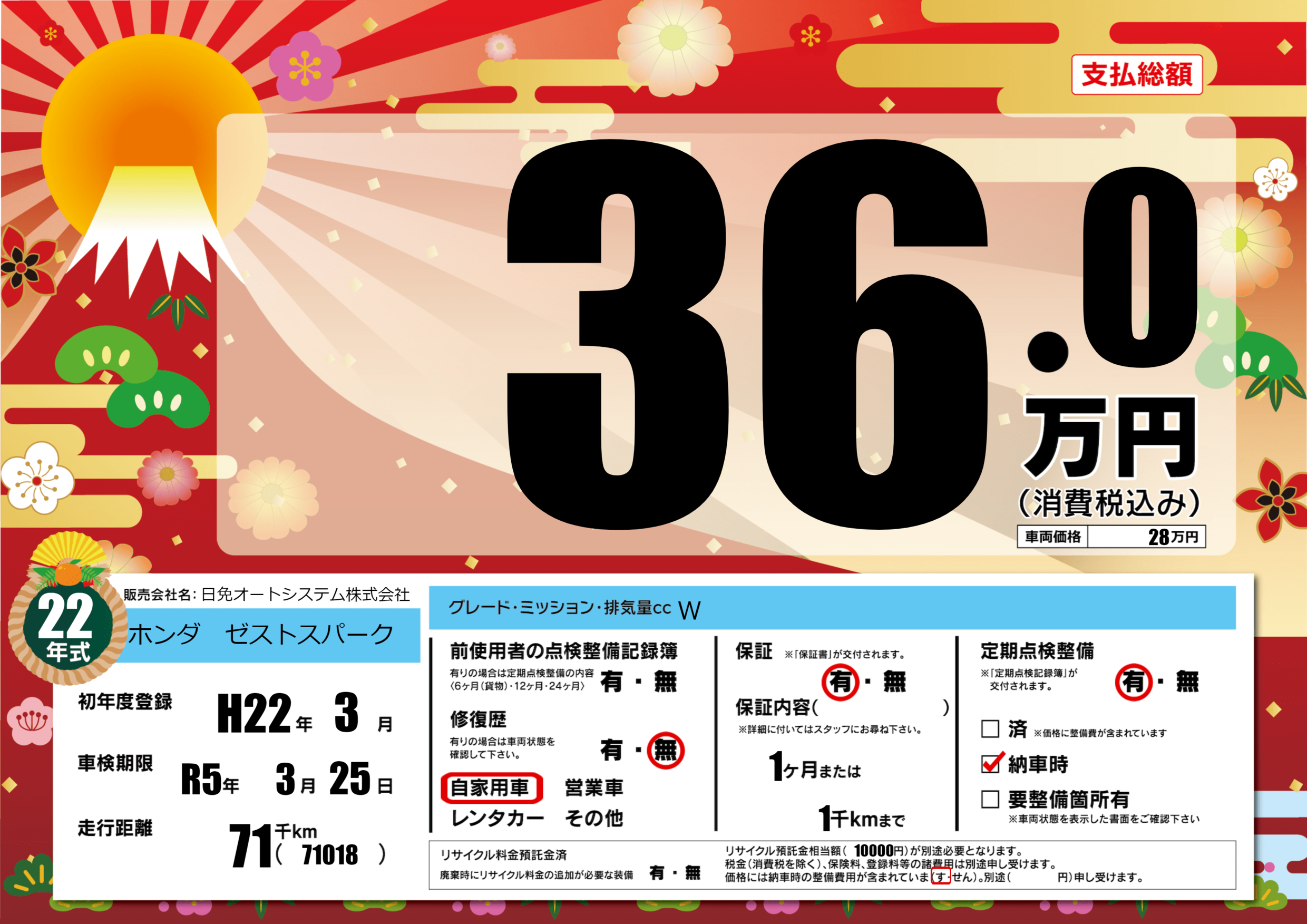 | 車名 | ホンダ ゼストスパーク | グレード ミッション 排気量 |