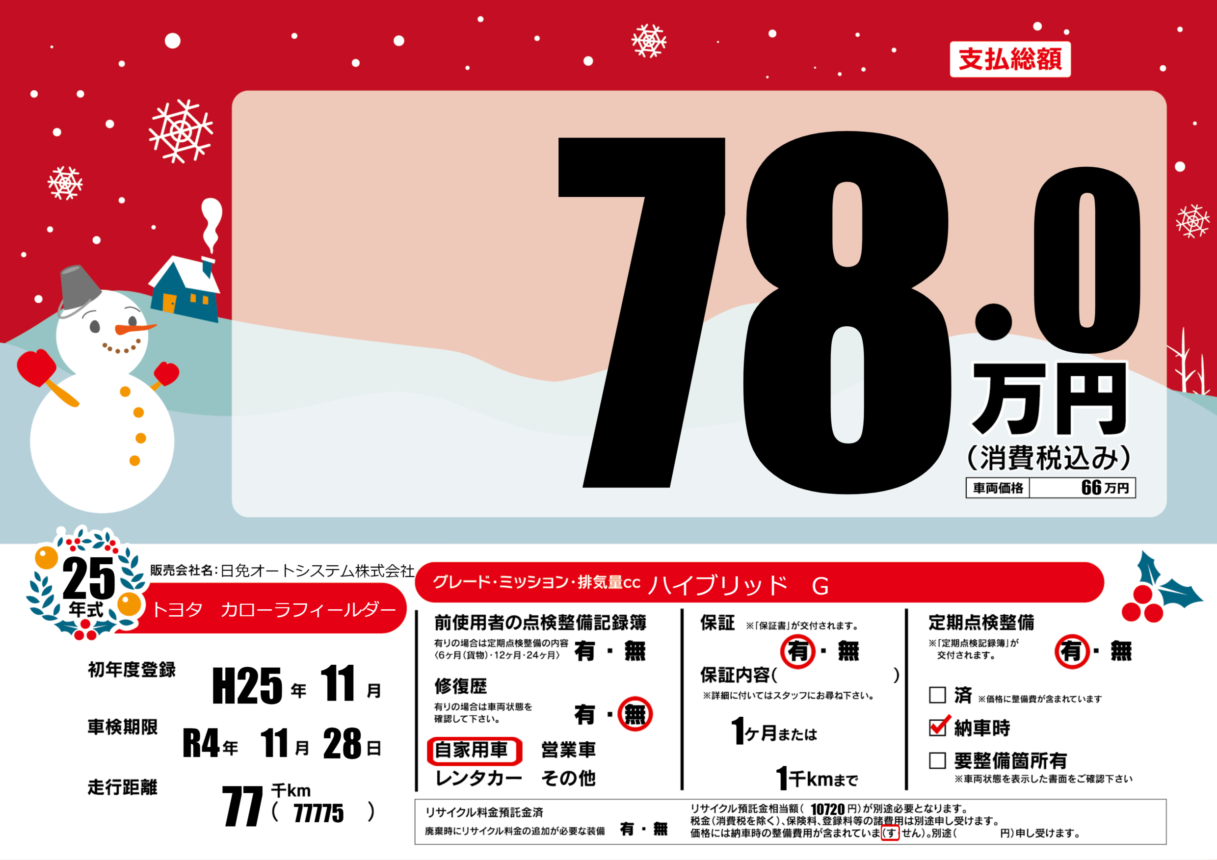 | 走行キロ | 7.7万km | 初年度登録 | H25年11月 |
