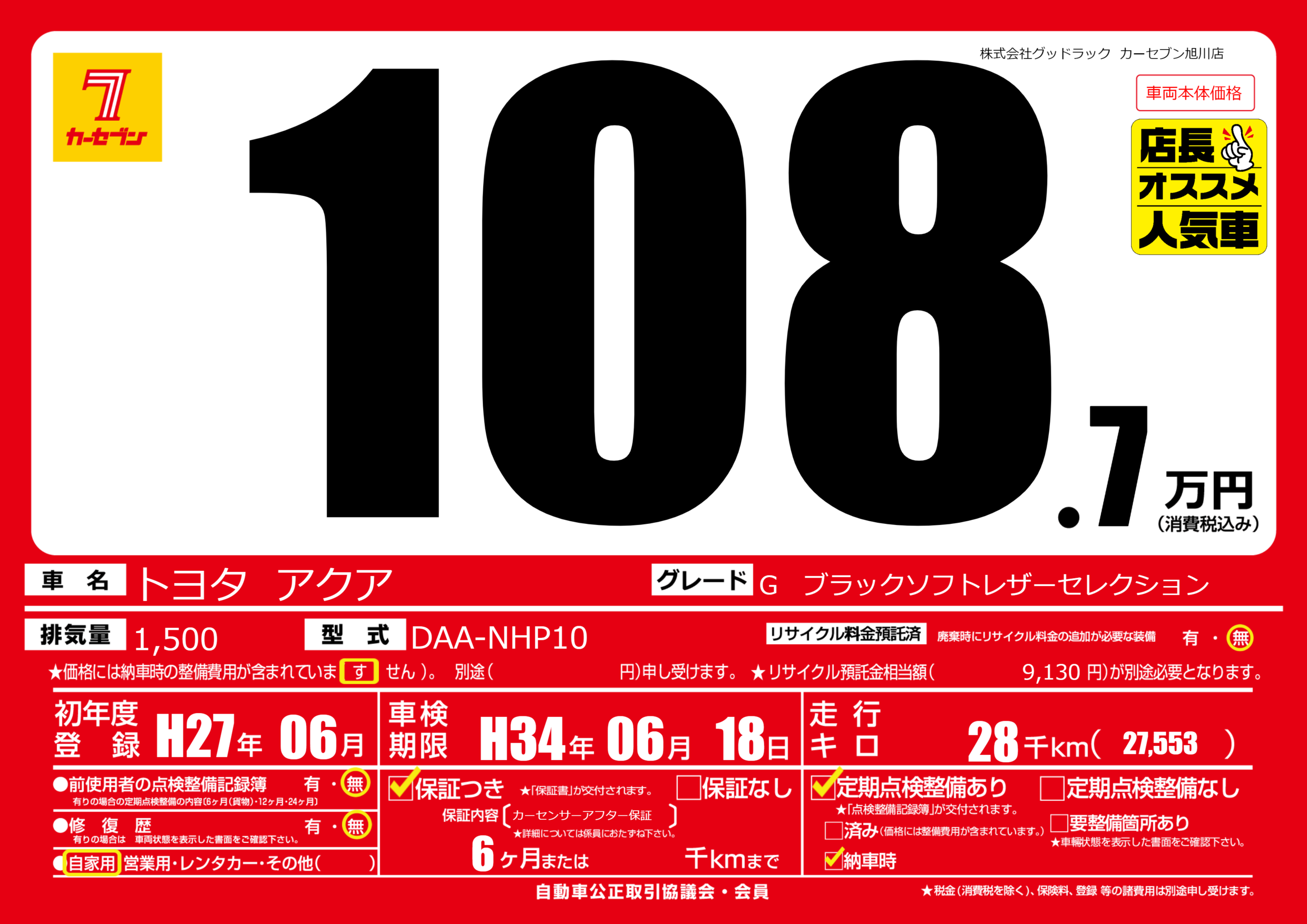 保証付き 保証内容(カーセンサーアフター保証) 6ヶ月または千km |