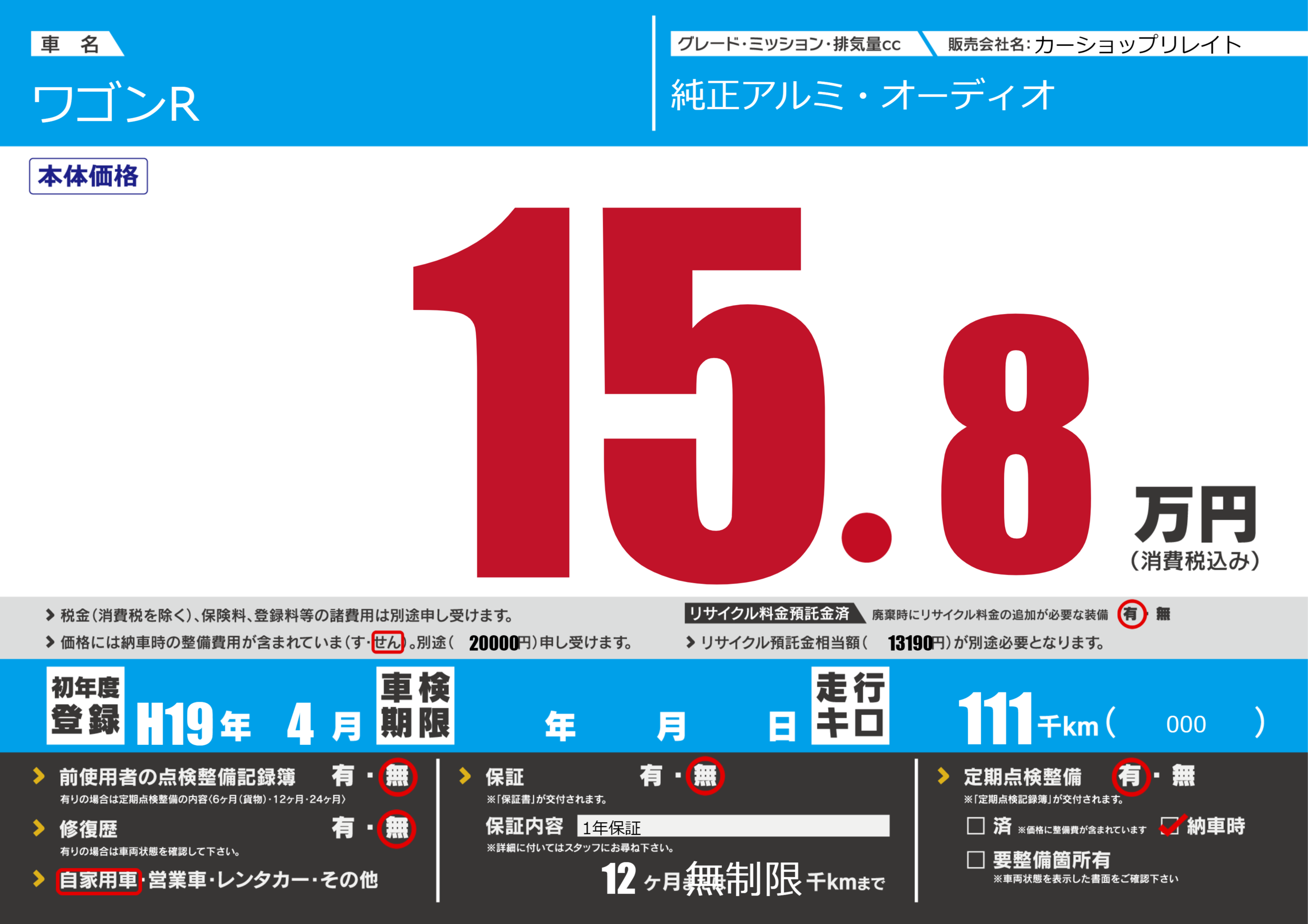| 走行キロ | 11.1万km | 初年度登録 | H19年4月 |