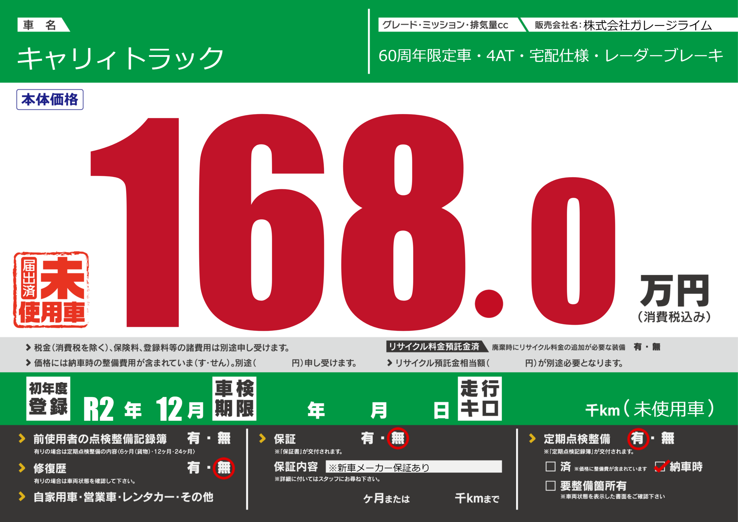 | 定期点検整備 | 定期点検整備あり 納車時あり | ||