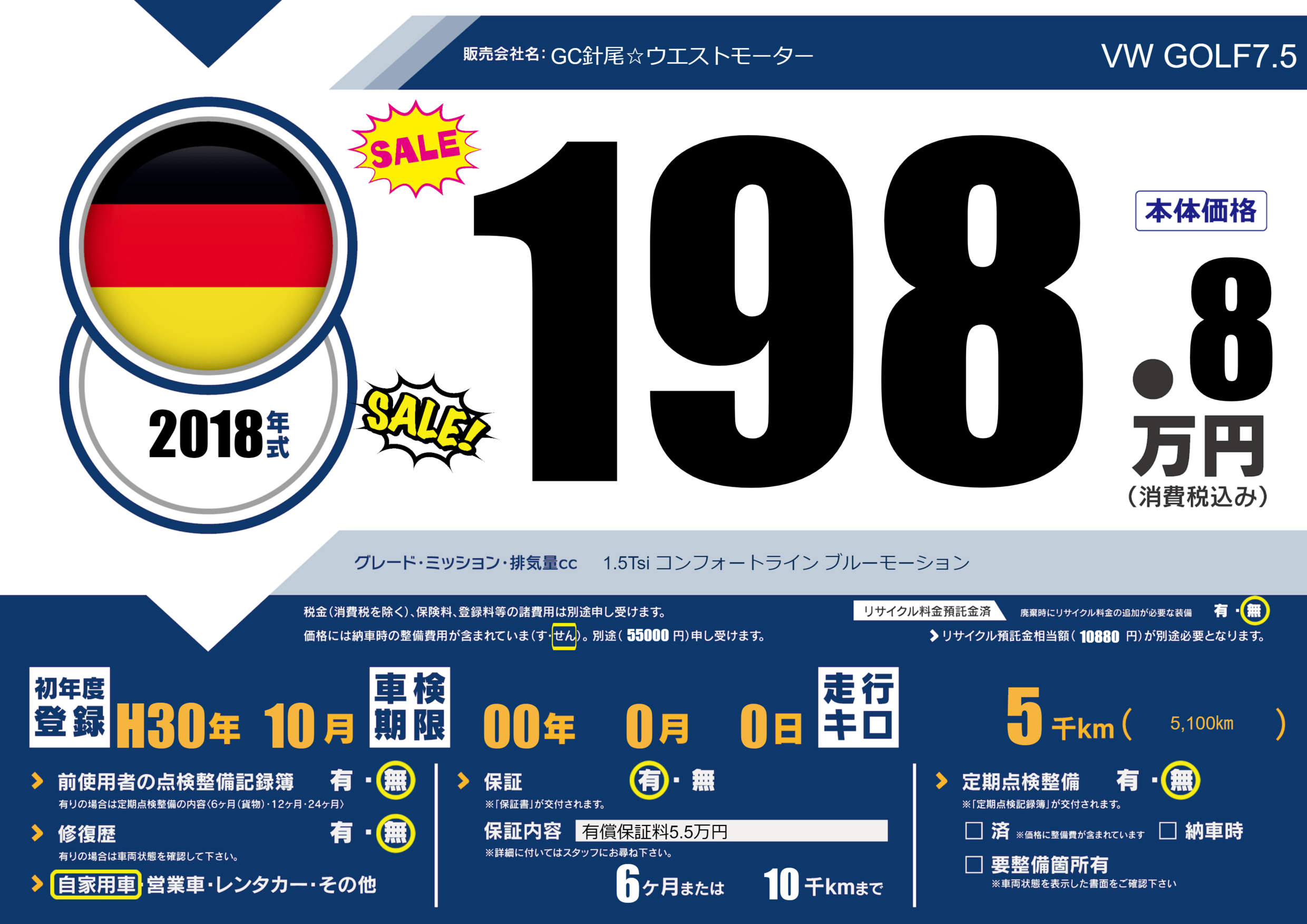 | 車名 | VW GOLF7.5 | グレード ミッション 排気量 |