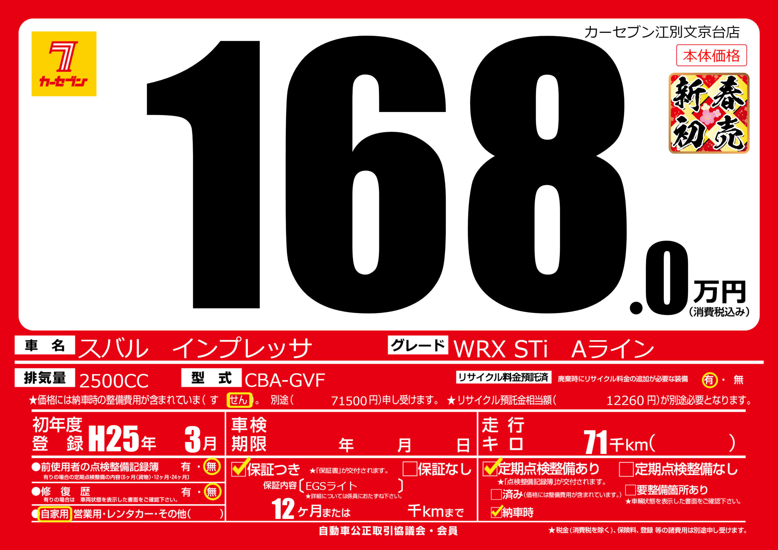 | 車名 | スバル インプレッサ | グレード ミッション 排気量 |