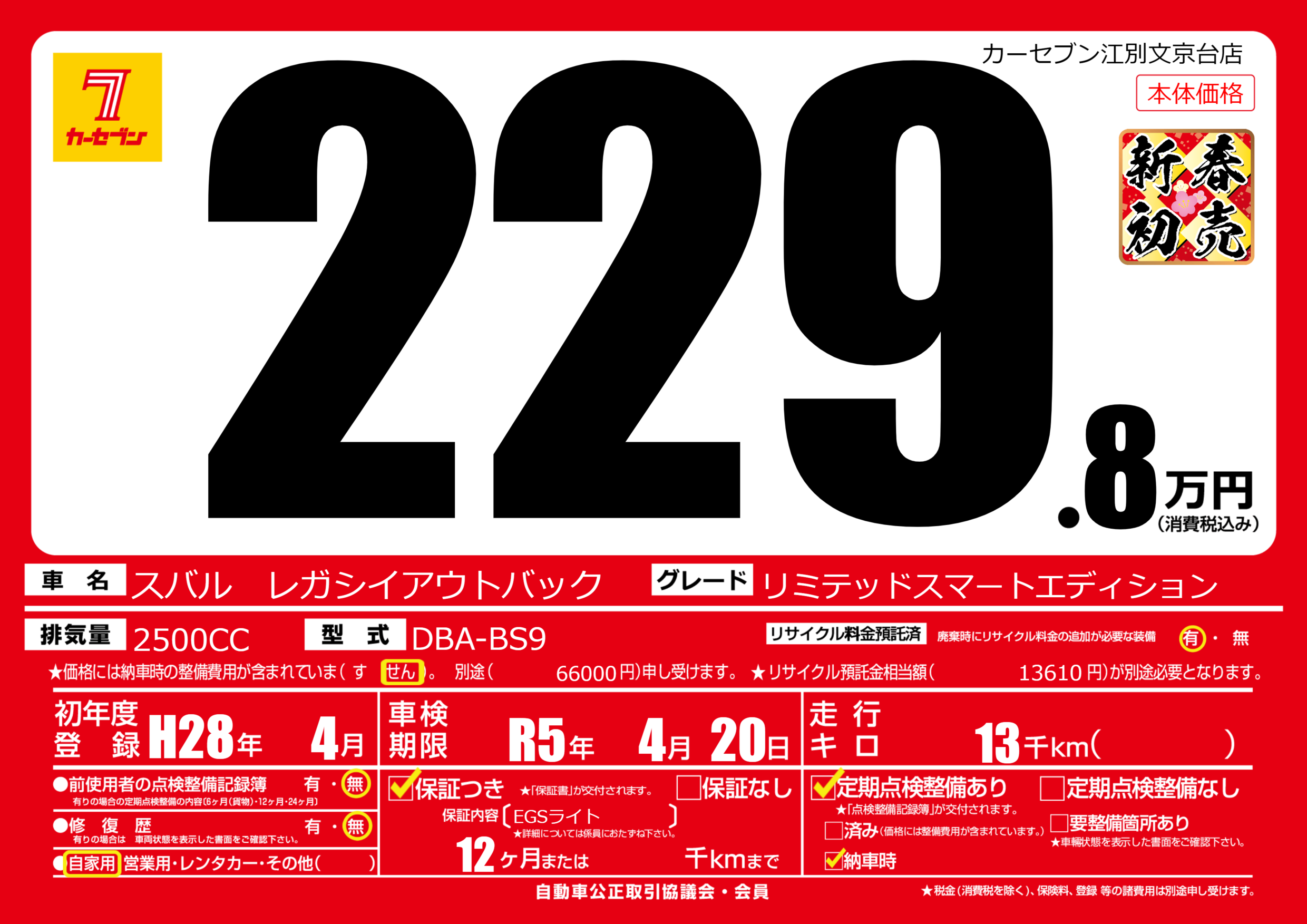 | 車名 | スバル レガシイアウトバック | グレード ミッション 排気量 |