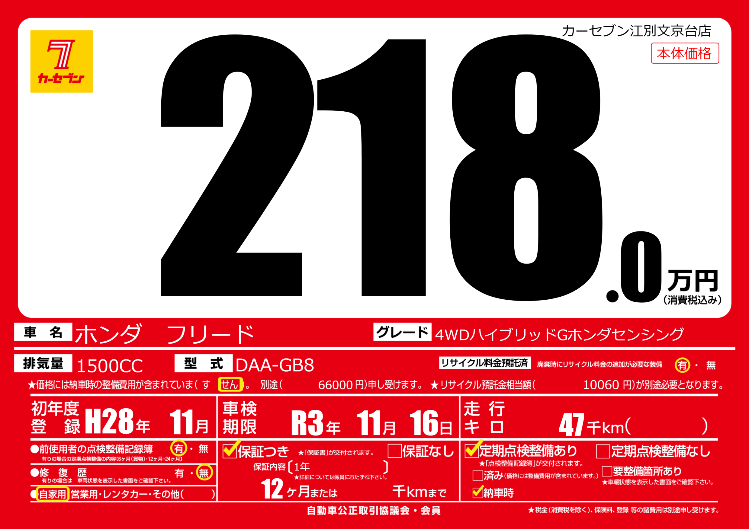 | 車名 | ホンダ フリード | グレード ミッション 排気量 |