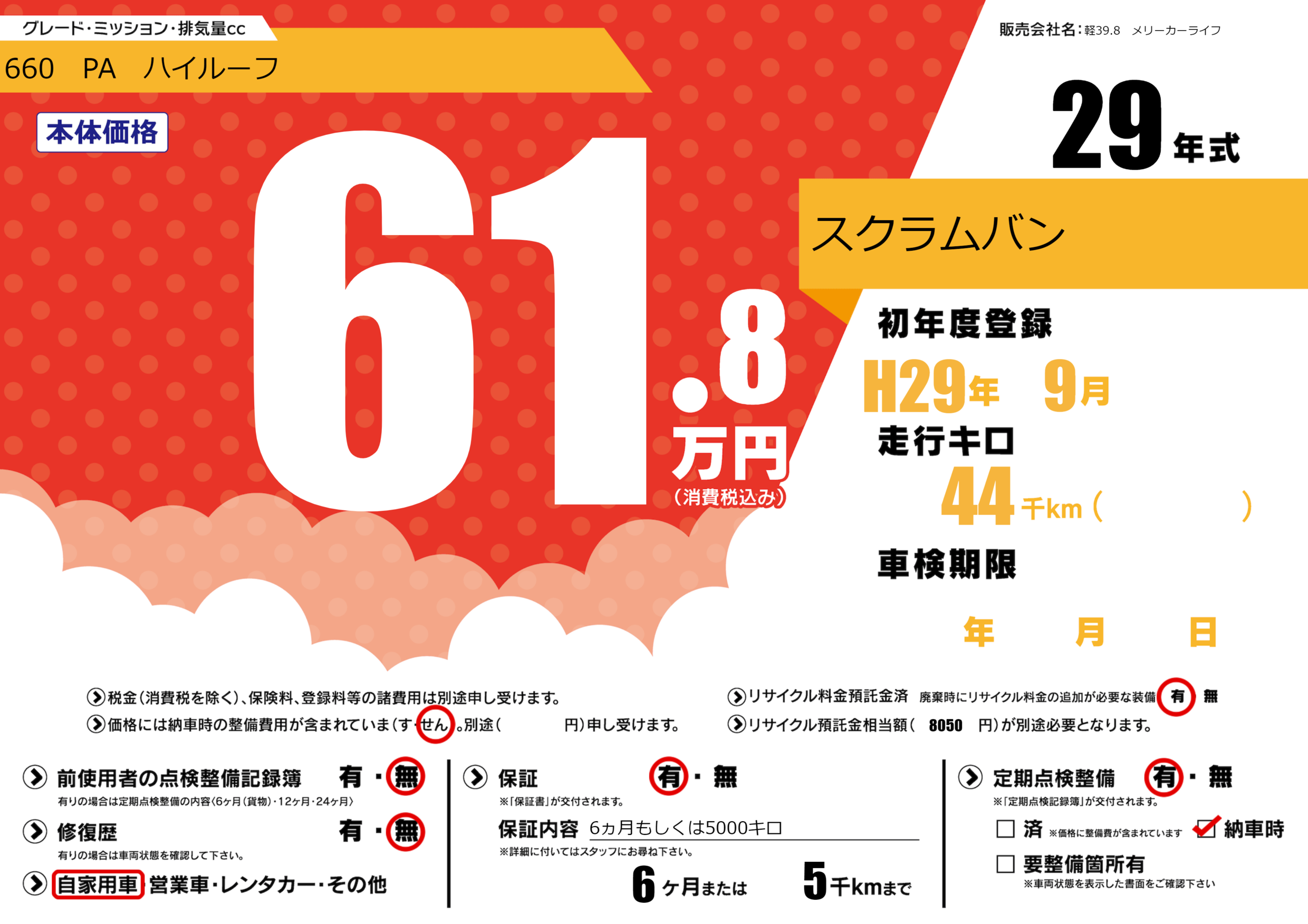 保証付き 保証内容(6ヵ月もしくは5000キロ) 6ヶ月または(5)千kmまで |
