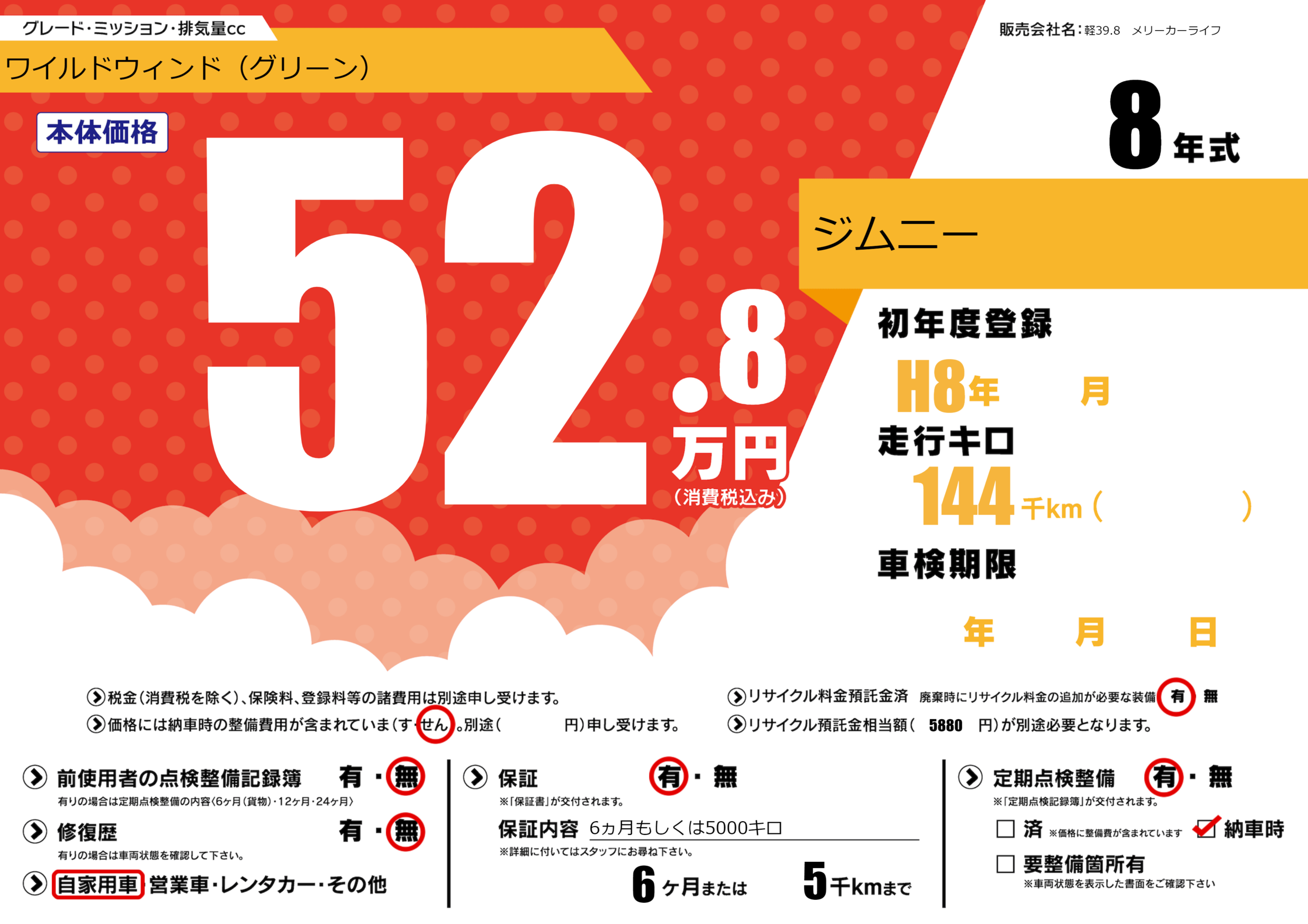 保証付き 保証内容(6ヵ月もしくは5000キロ) 6ヶ月または5千km |
