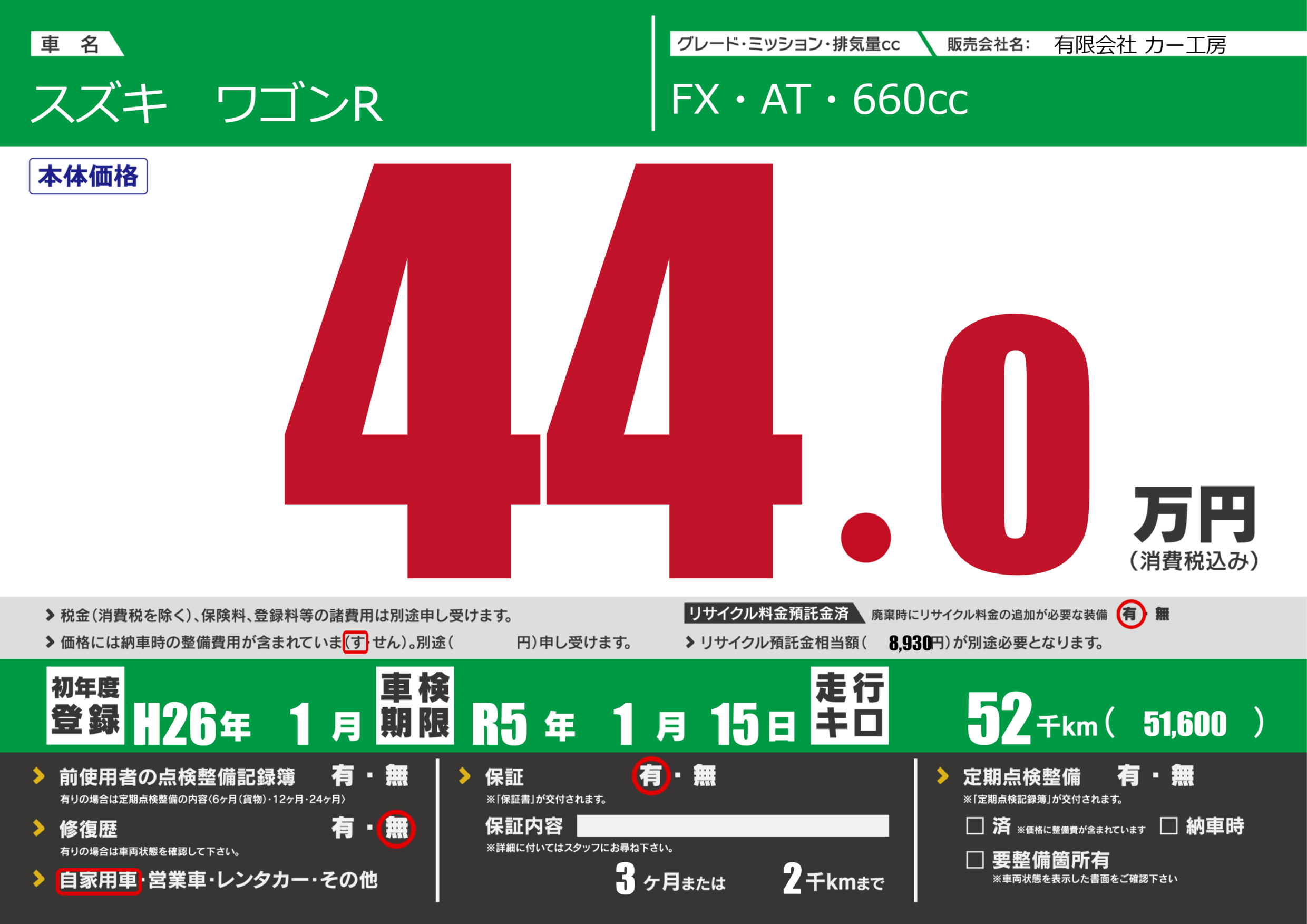 | 車名 | スズキ ワゴンR | グレード ミッション 排気量 |