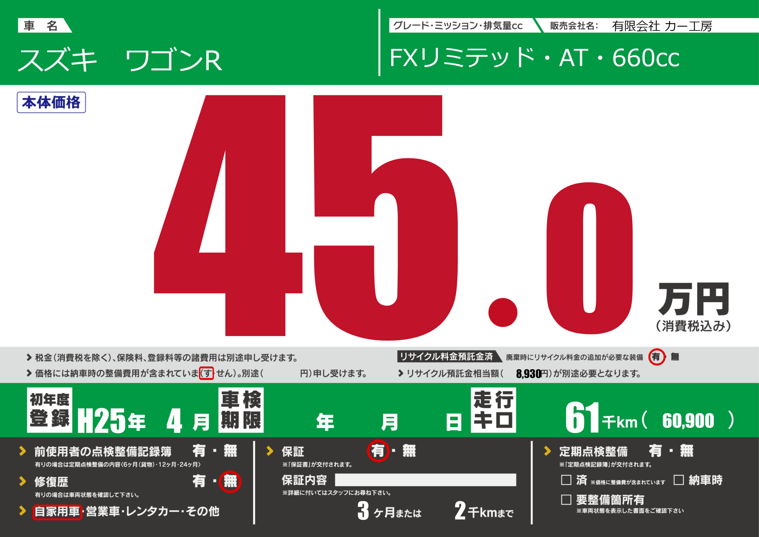 | 走行キロ | 6.1万km | 初年度登録 | H25年4月 |